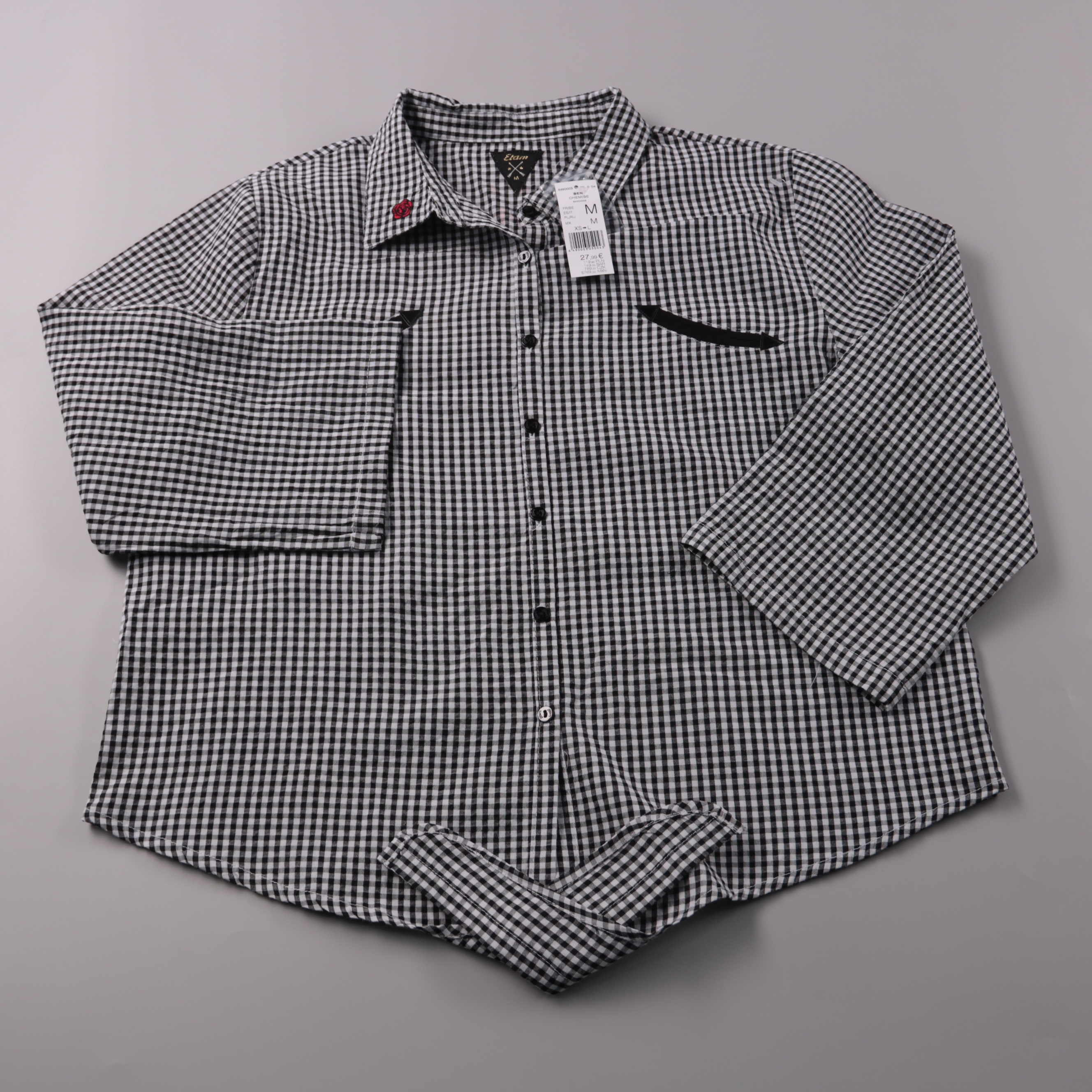 Мужская рубашка Etam в мелкую чёрно-белую клетку, с длинным рукавом и нагрудным карманом. Подойдёт для офиса и повседневных образов, хорошо смотрится как самостоятельно, так и под пиджак. Практичный материал почти не мнётся и легко стирается.