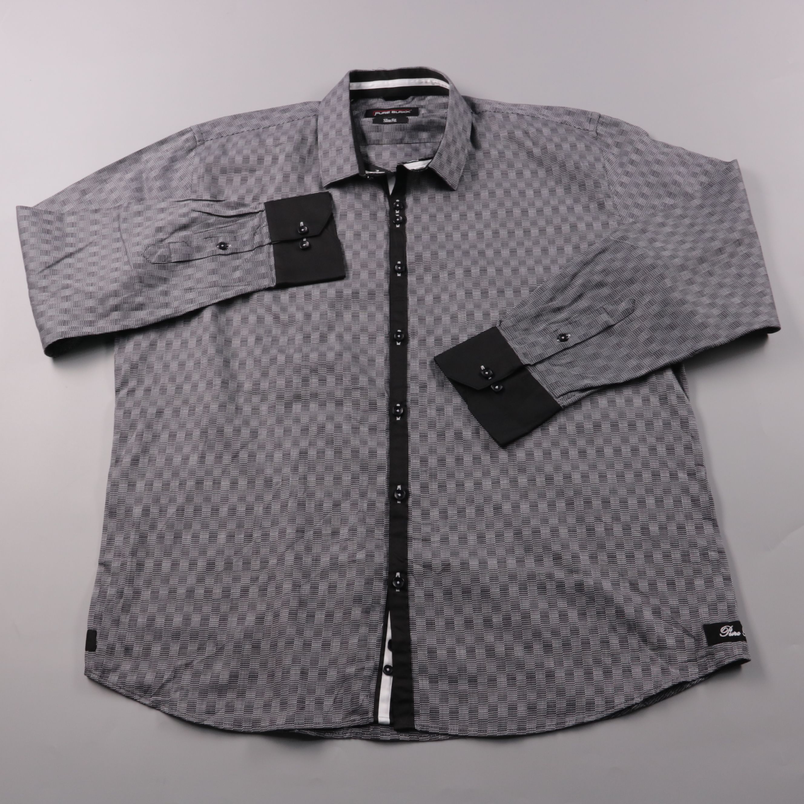 Мужская рубашка Pure Blakk Slim Fit из хлопка, серого цвета с мелким геометрическим рисунком и контрастной чёрной планкой и манжетами. Подойдёт для офиса и повседневной носки в сочетании с брюками или джинсами. Натуральный хлопок хорошо дышит и комфорт...