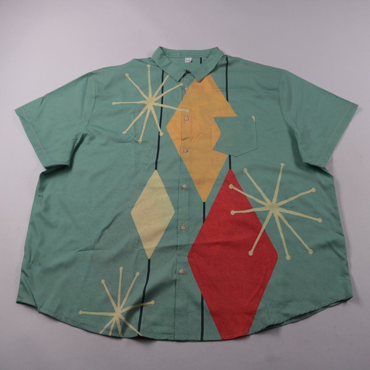 Мужская рубашка с коротким рукавом и ярким геометрическим принтом, застёжка на пуговицы, есть нагрудный карман. Подойдёт для повседневных летних образов и отдыха. Свободный крой даёт комфорт в движении.