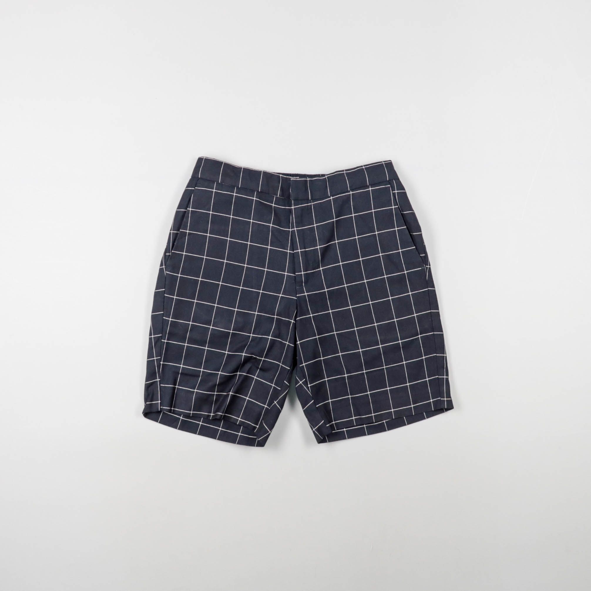 Мужские шорты в темно-синем цвете с белой клеткой, с карманами и аккуратной посадкой. Подойдут для лета и теплой погоды — на каждый день, в отпуск или на прогулки. Практичный плюс: ткань не маркая, а пояс с резинкой сзади добавляет комфорта в движении.