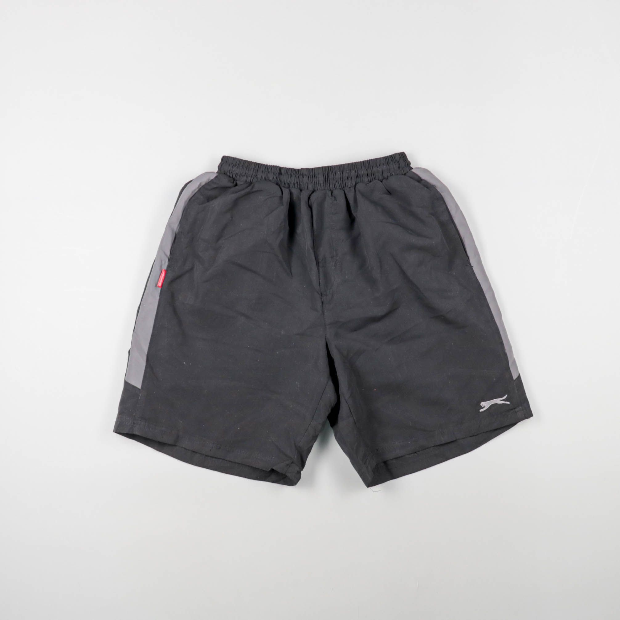 Мужские спортивные шорты Slazenger чёрного цвета с серыми вставками и эластичным поясом. Подойдут для тренировок, пробежек и активного отдыха в тёплую погоду. Лёгкий синтетический материал быстро сохнет и не сковывает движения.