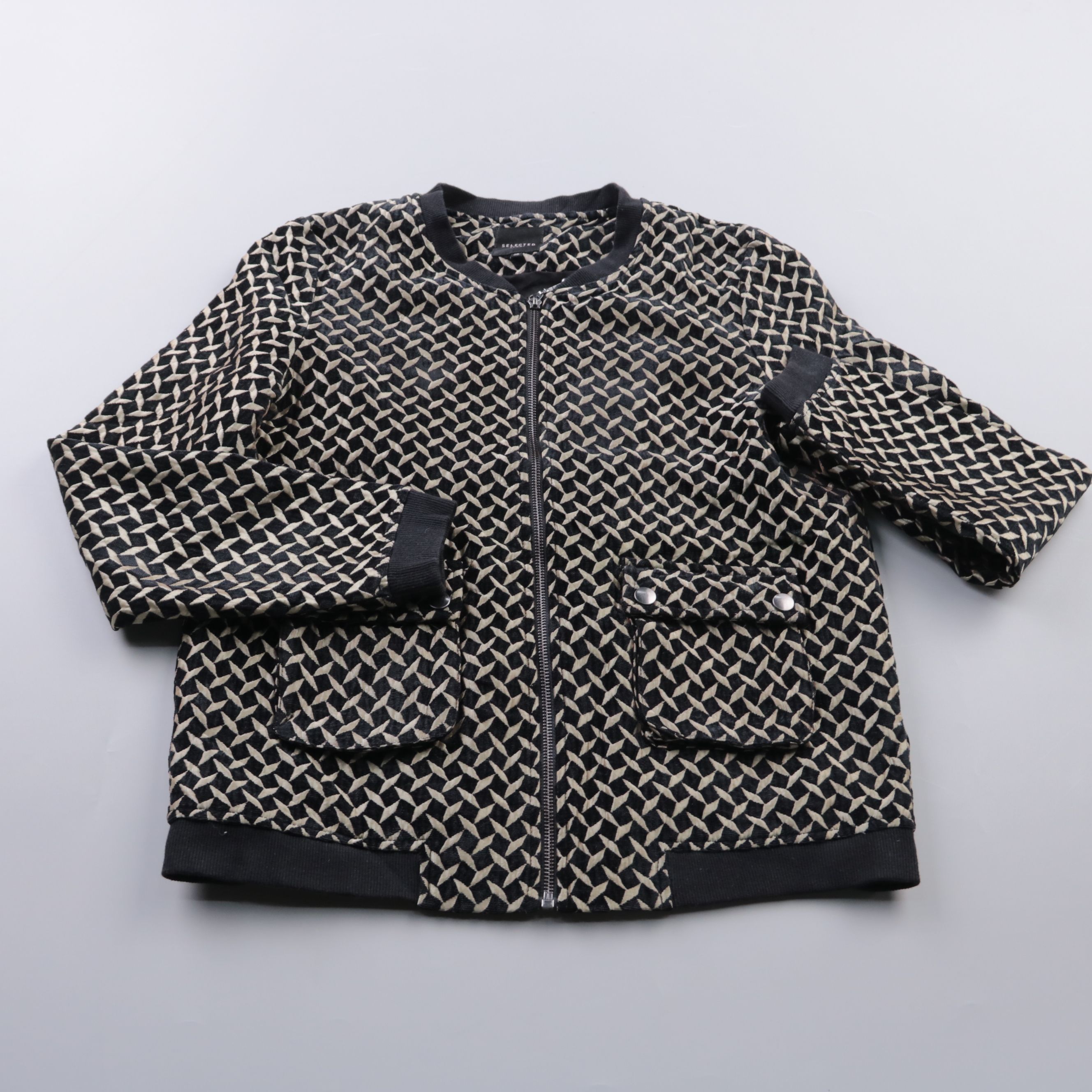 Лёгкая куртка-бомбер Selected Femme с геометрическим жаккардовым узором и застёжкой на молнию. Подойдёт для повседневных образов в демисезон, когда нужна аккуратная верхняя одежда без лишнего объёма. Практичный плюс — эластичные манжеты и низ лучше защ...