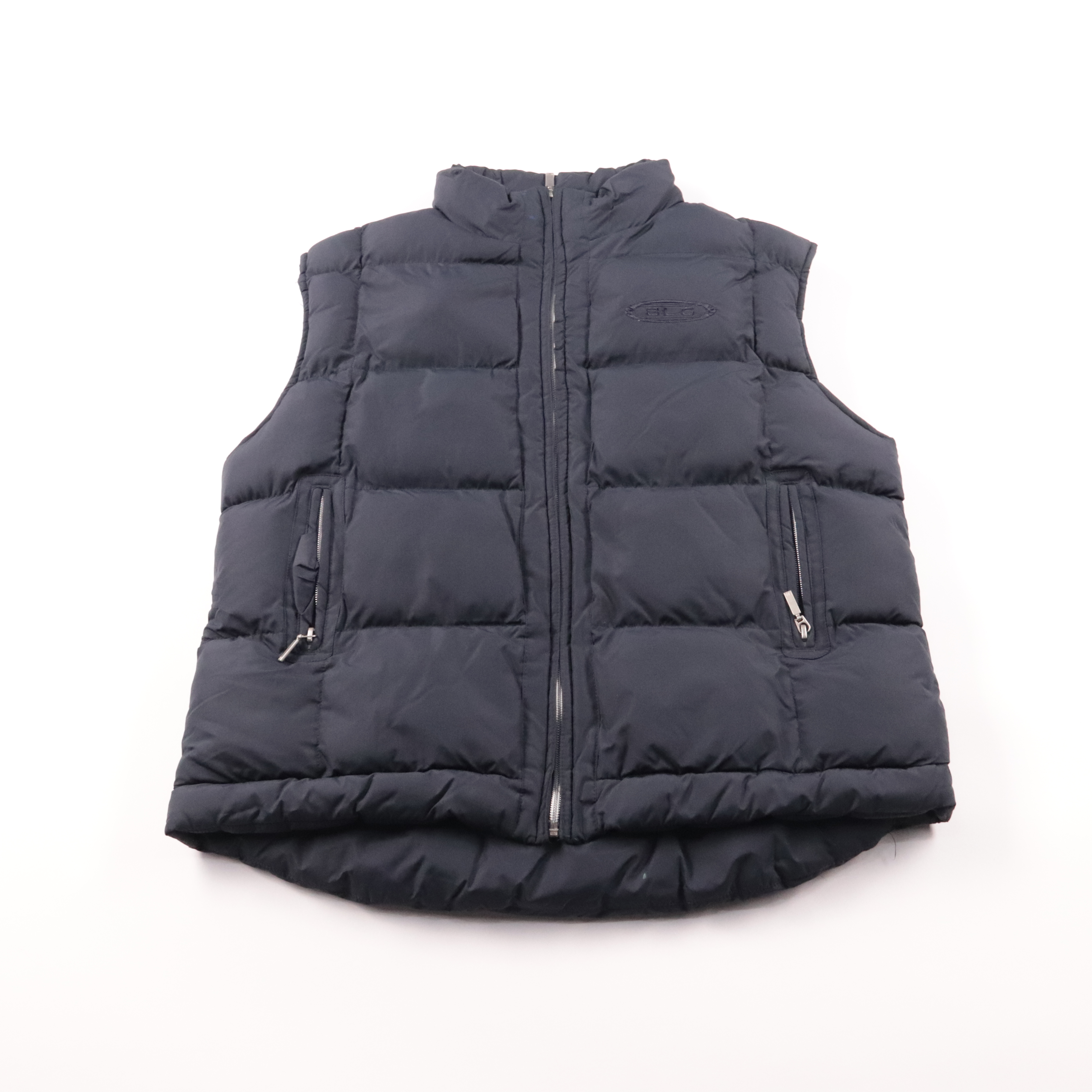 Утеплённый стёганый жилет SLC тёмно-синего цвета с высоким воротником и застёжкой на молнию. Подойдёт для прохладной погоды в межсезонье и удобно носится поверх худи или свитера. Практичный плюс — карманы на молнии спереди и дополнительный карман сзади...