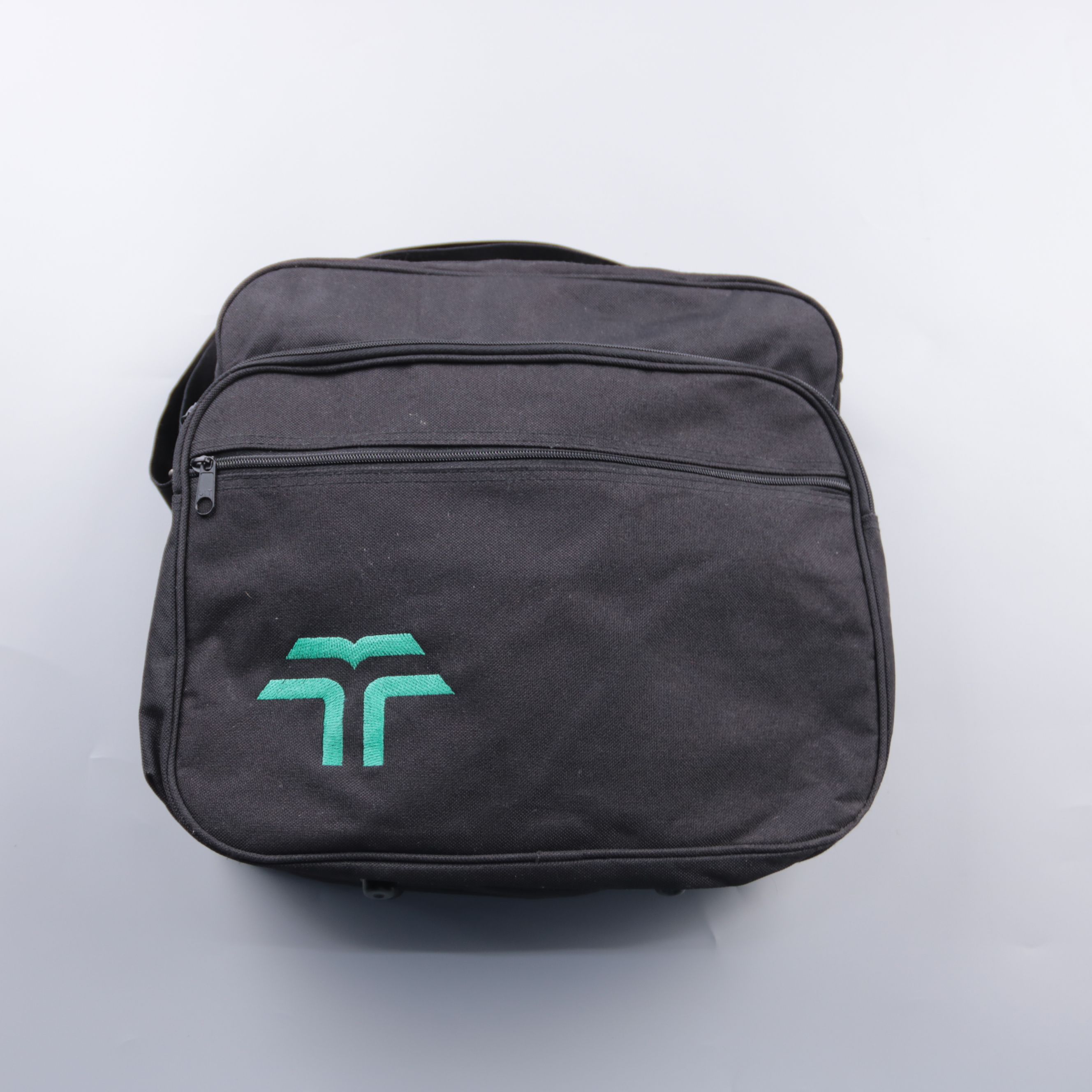 Текстильная сумка через плечо в чёрном цвете с вышитым логотипом, подойдёт для повседневных дел и поездок. Есть вместительное основное отделение и внешний карман на молнии, удобно разложить документы и мелочи. Плотный материал и ножки на дне помогают д...