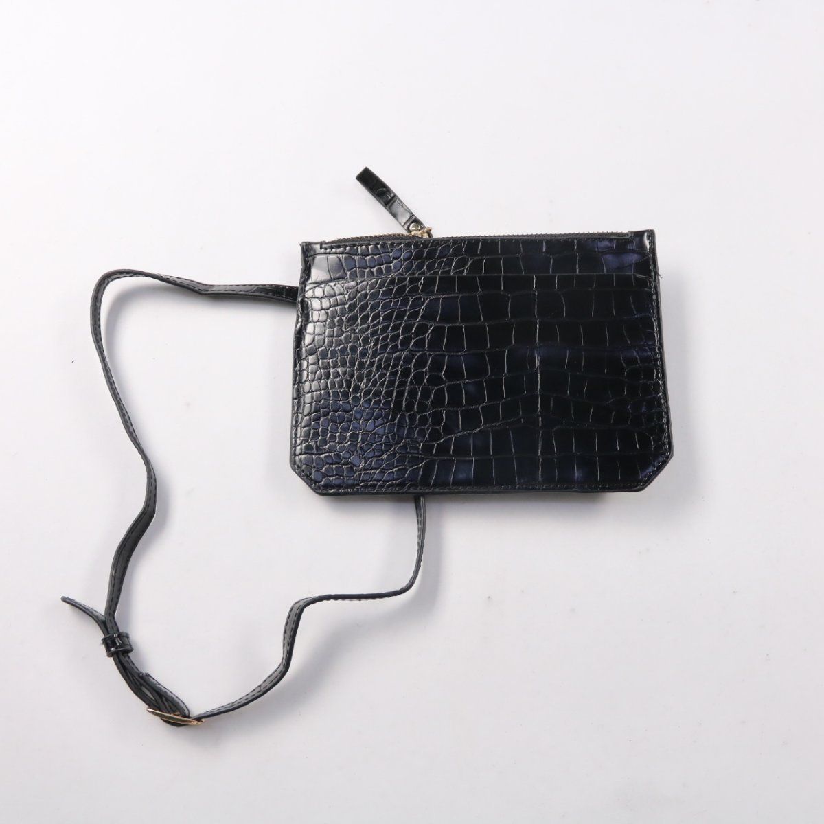 Небольшая сумка кросс-боди с длинным ремешком и застёжкой на молнию, выполнена под крокодиловую кожу. Подойдёт для прогулок и поездок, когда нужно взять только самое необходимое (телефон, карты, ключи). Компактный формат удобно носить на плече или через плечо.