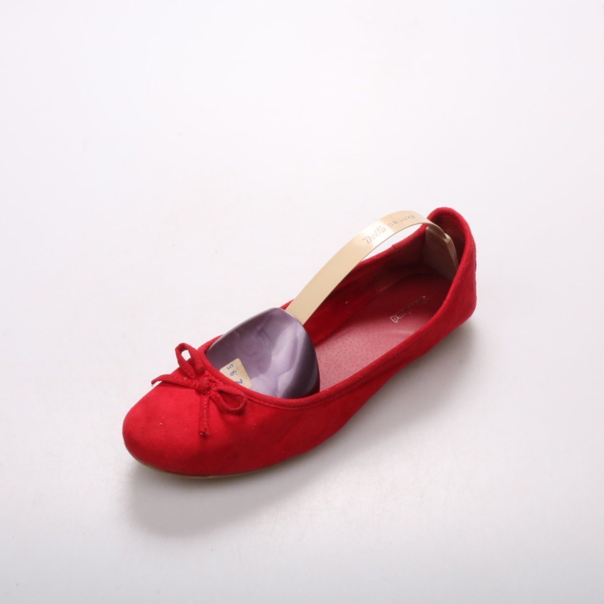 Балетки Graceland из красной замши с декоративным бантиком на носке. Подойдут для повседневных образов летом и в помещении, легко сочетаются с платьями и джинсами. Плоская подошва делает пару удобной для прогулок и работы.