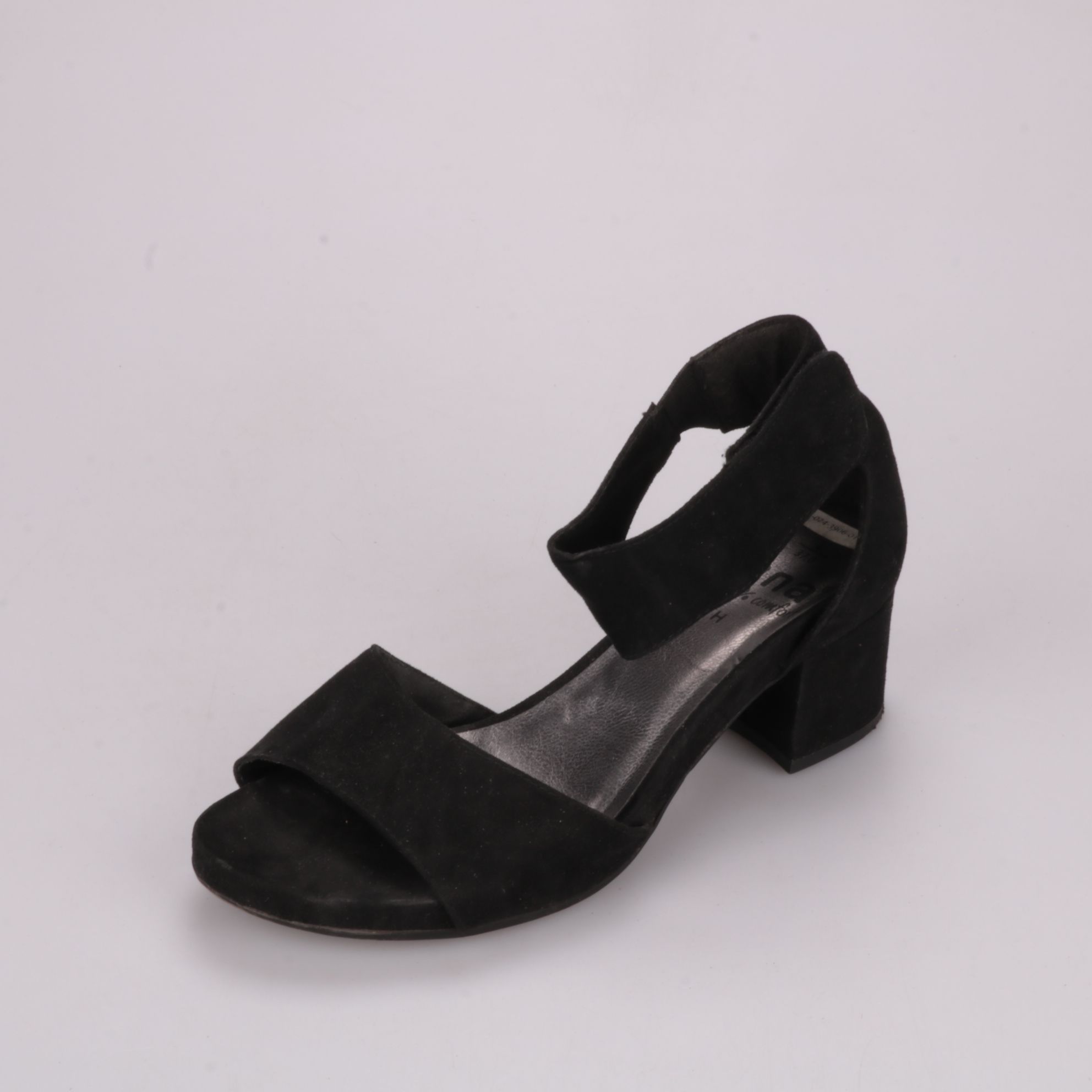 Босоножки Jana из чёрной замши с широкими ремешками и устойчивым каблуком. Подойдут для повседневной носки и на выход в тёплую погоду, хорошо сочетаются с платьями и брюками. Широкий ремешок на щиколотке фиксирует стопу и делает ходьбу более удобной.