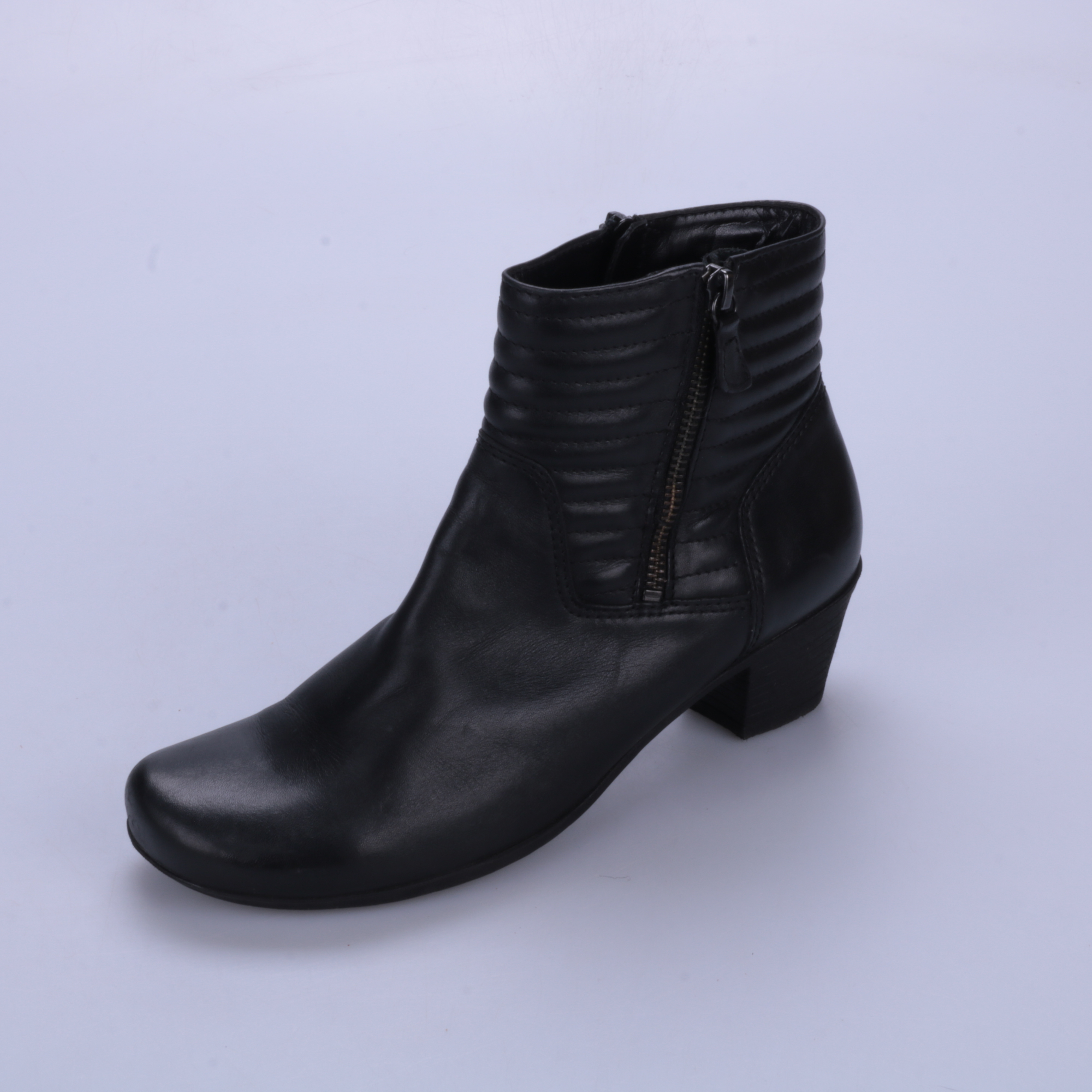 Женские ботильоны из чёрной кожи с простёжкой на голенище и застёжкой-молнией сбоку. Подойдут для повседневных образов в межсезонье и на прохладную погоду. Устойчивый каблук делает пару удобной для длительной ходьбы.