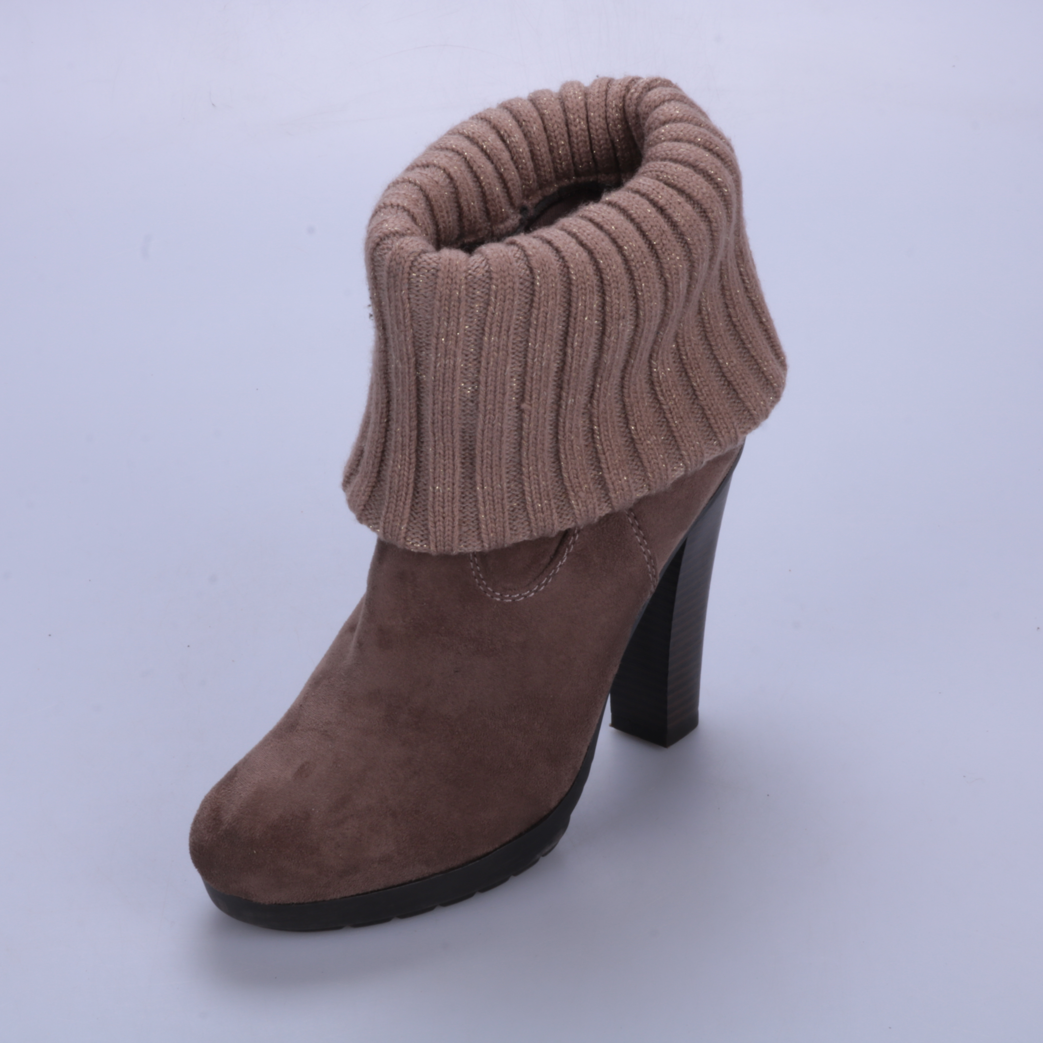 Женские ботильоны из коричневой замши с вязаным отворотом-манжетой и устойчивым каблуком. Подойдут для повседневных образов в прохладную погоду, хорошо смотрятся с джинсами и юбками. Практичная подошва с протектором даёт более уверенное сцепление на ул...