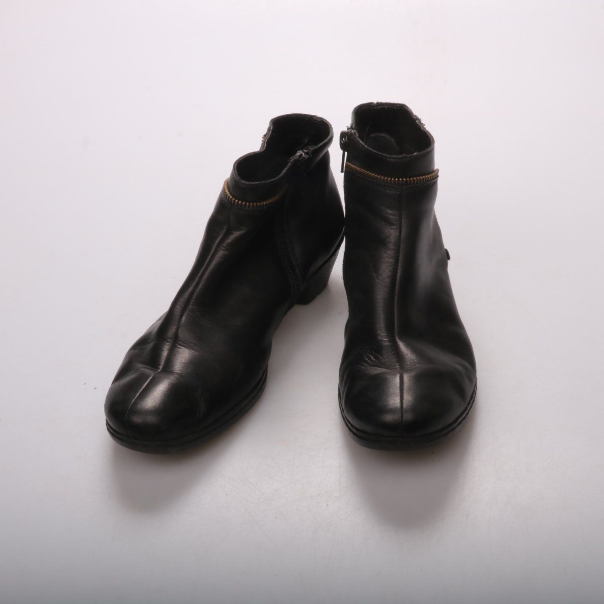 Женские ботильоны Rieker из чёрной кожи с боковой молнией и невысоким устойчивым каблуком. Подойдут для повседневной носки в демисезон, удобно сочетать с брюками и юбками. Молния позволяет быстро обуваться, а подошва практична для города.