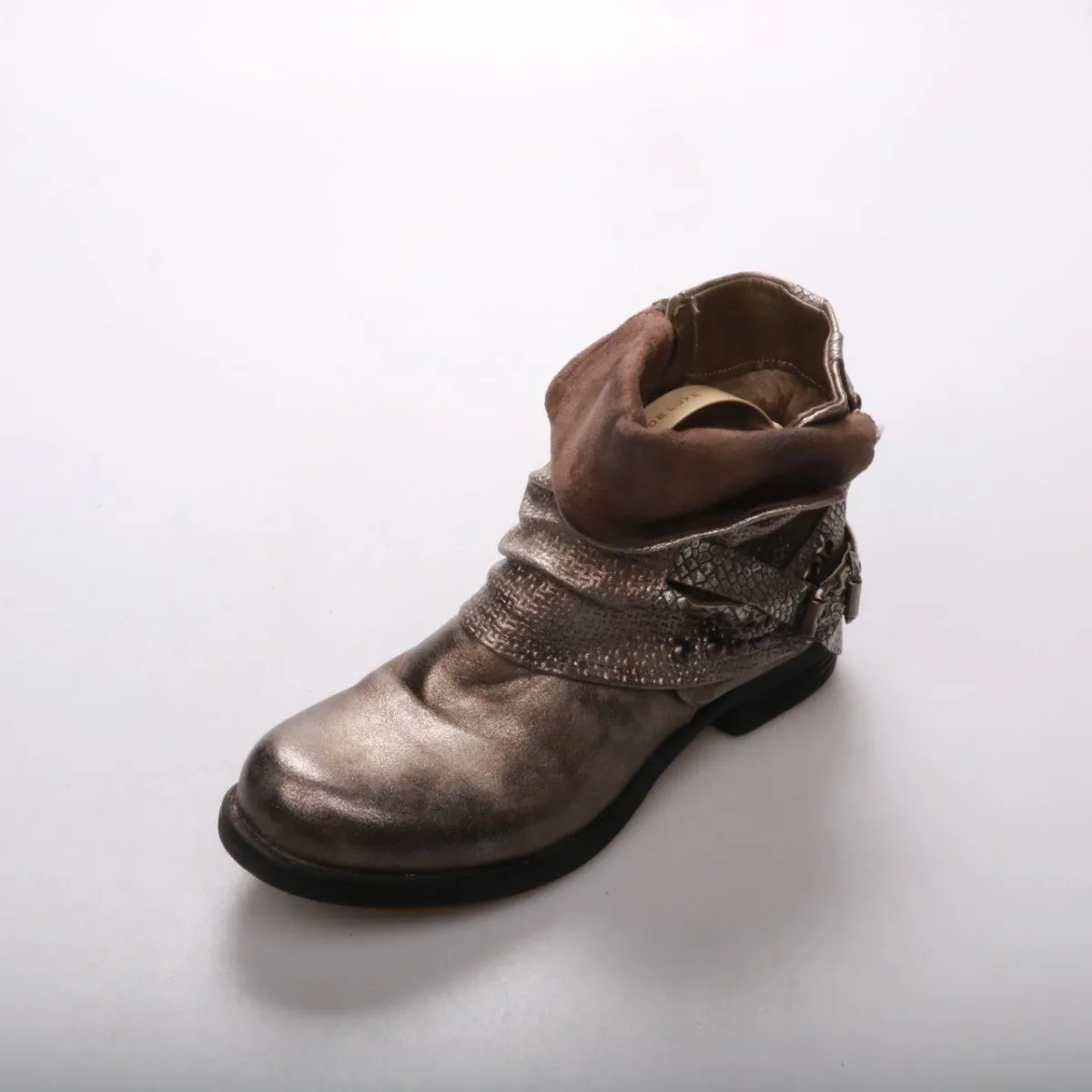 Женские ботинки с боковой молнией и мягким отворотом на голенище, выполнены в металлическом серебристо-коричневом оттенке с фактурными вставками. Подойдут для повседневных образов в межсезонье, хорошо сочетаются с джинсами и платьями. Удобно надевать и снимать благодаря молнии.