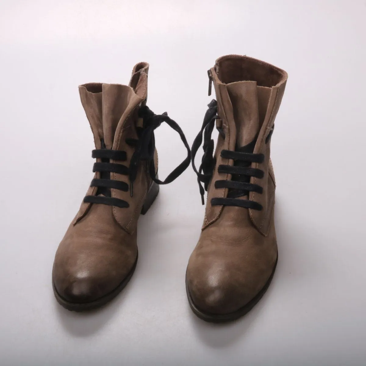 Ботинки CMT из коричневой кожи с шнуровкой и боковой молнией. Подойдут для повседневной носки в демисезон и сочетания с джинсами или платьями. Устойчивый невысокий каблук и рельефная подошва дают более уверенное сцепление на улице.