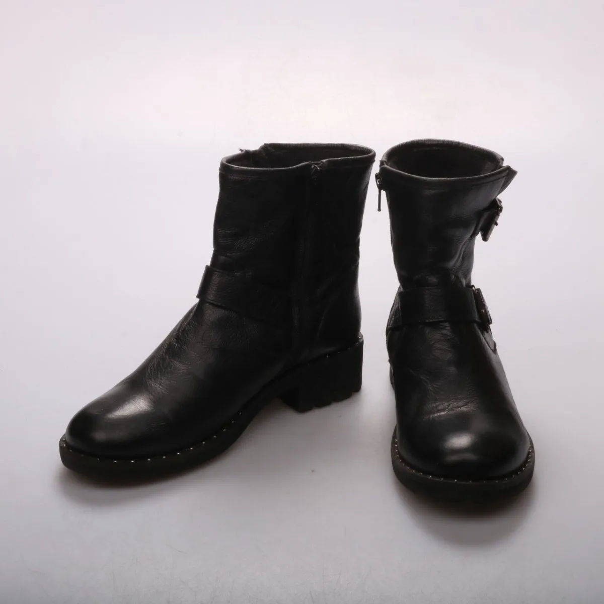 Женские кожаные ботинки без бренда, чёрного цвета, с ремешками и пряжками и боковой молнией. Подойдут на прохладную погоду в городе, на прогулки и повседневные образы. Рельефная подошва даёт более уверенное сцепление и устойчивость.