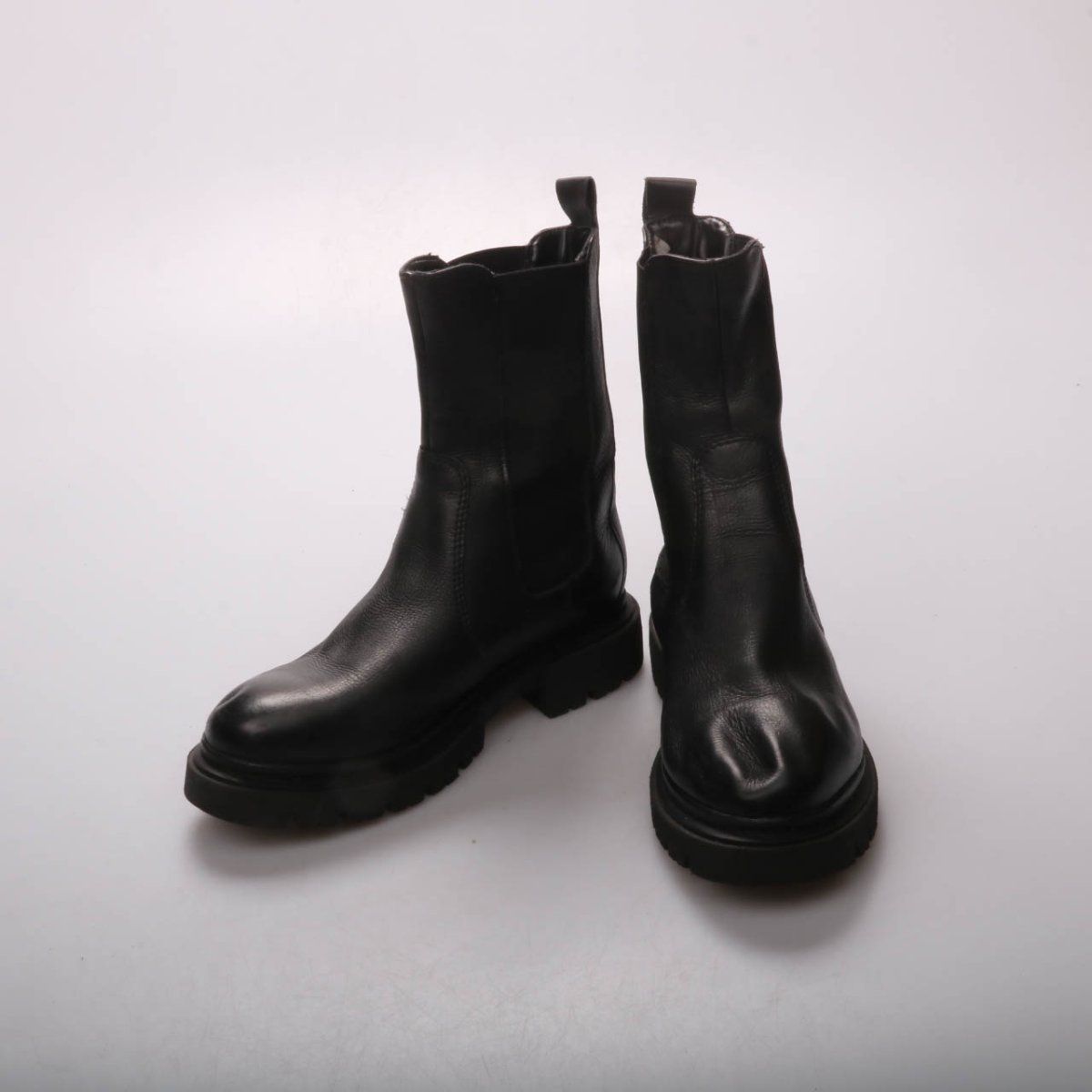 Женские чёрные кожаные ботинки без видимого бренда, с массивной тракторной подошвой и удобными петлями для надевания. Подойдут для повседневной носки в межсезонье и на прохладную погоду. Рельефная подошва даёт более уверенное сцепление на мокром асфальте.