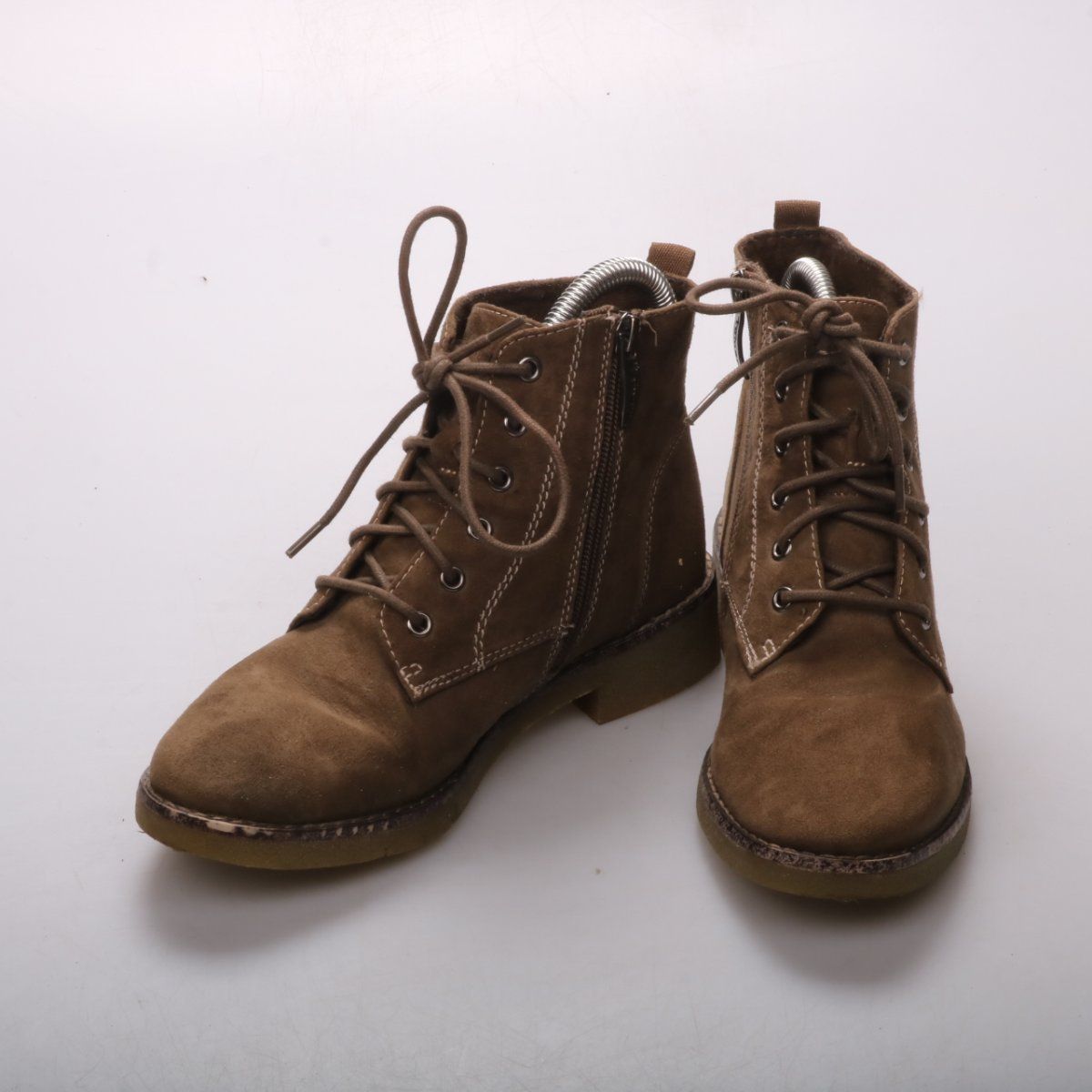Женские ботинки Tamaris из коричневой замши на шнуровке, с боковой молнией и низким устойчивым каблуком. Подойдут для повседневных образов в прохладную погоду, удобно надевать и снимать за счёт молнии. Рельефная подошва даёт более уверенное сцепление на улице.