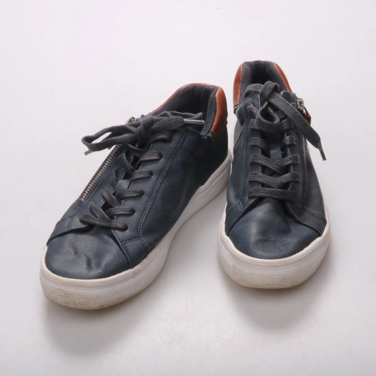 Кеды Graceland в тёмно-синем цвете с белой резиновой подошвой и коричневой вставкой на пятке, есть боковая молния. Подойдут для повседневной носки в городе и на прогулки в тёплый сезон и межсезонье. Удобная шнуровка помогает хорошо фиксировать ногу.