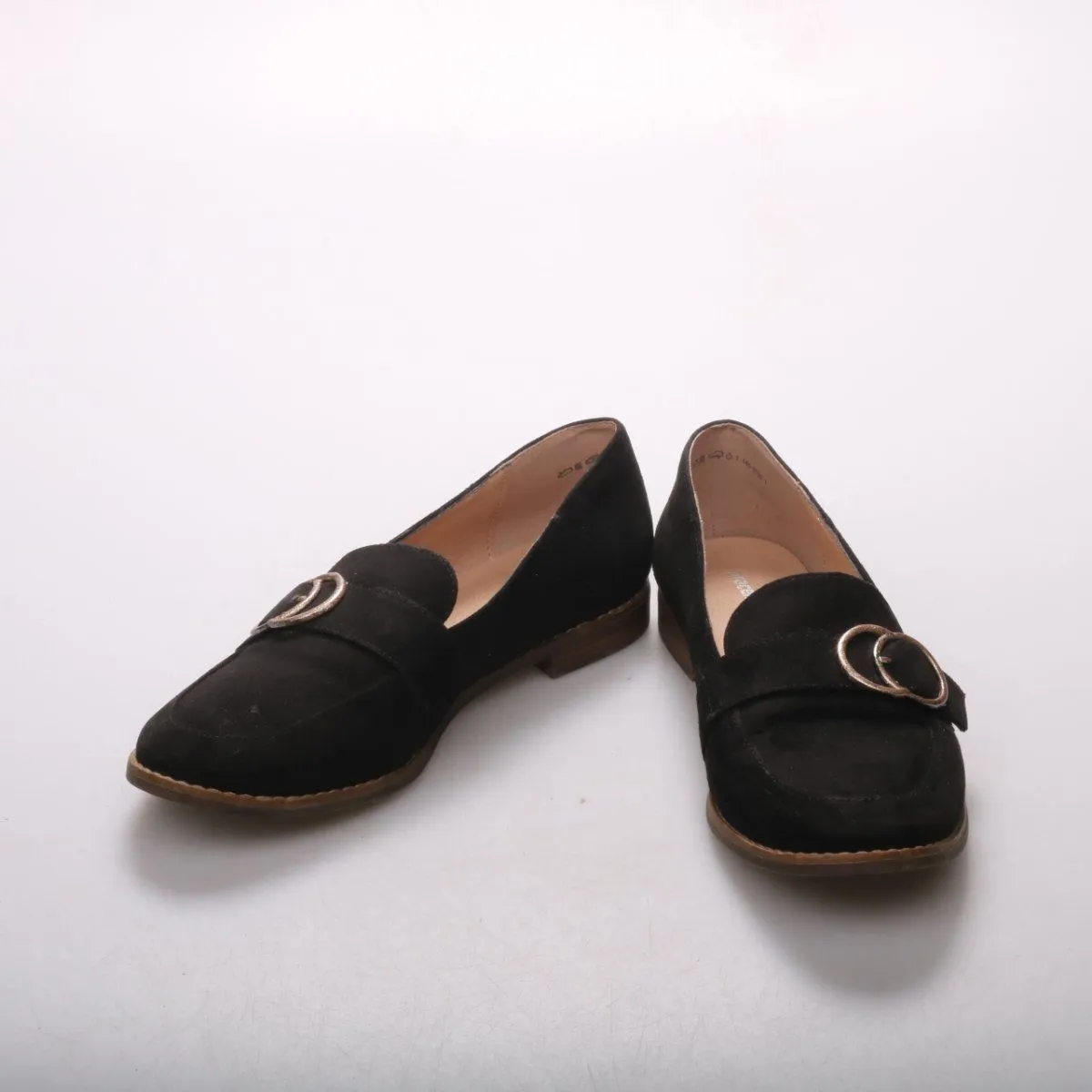 Лоферы Graceland из чёрной искусственной замши с декоративной пряжкой и невысоким каблуком. Подойдут для повседневной носки и офисных образов в демисезон. Практичная подошва устойчива и не скользит на гладких покрытиях.