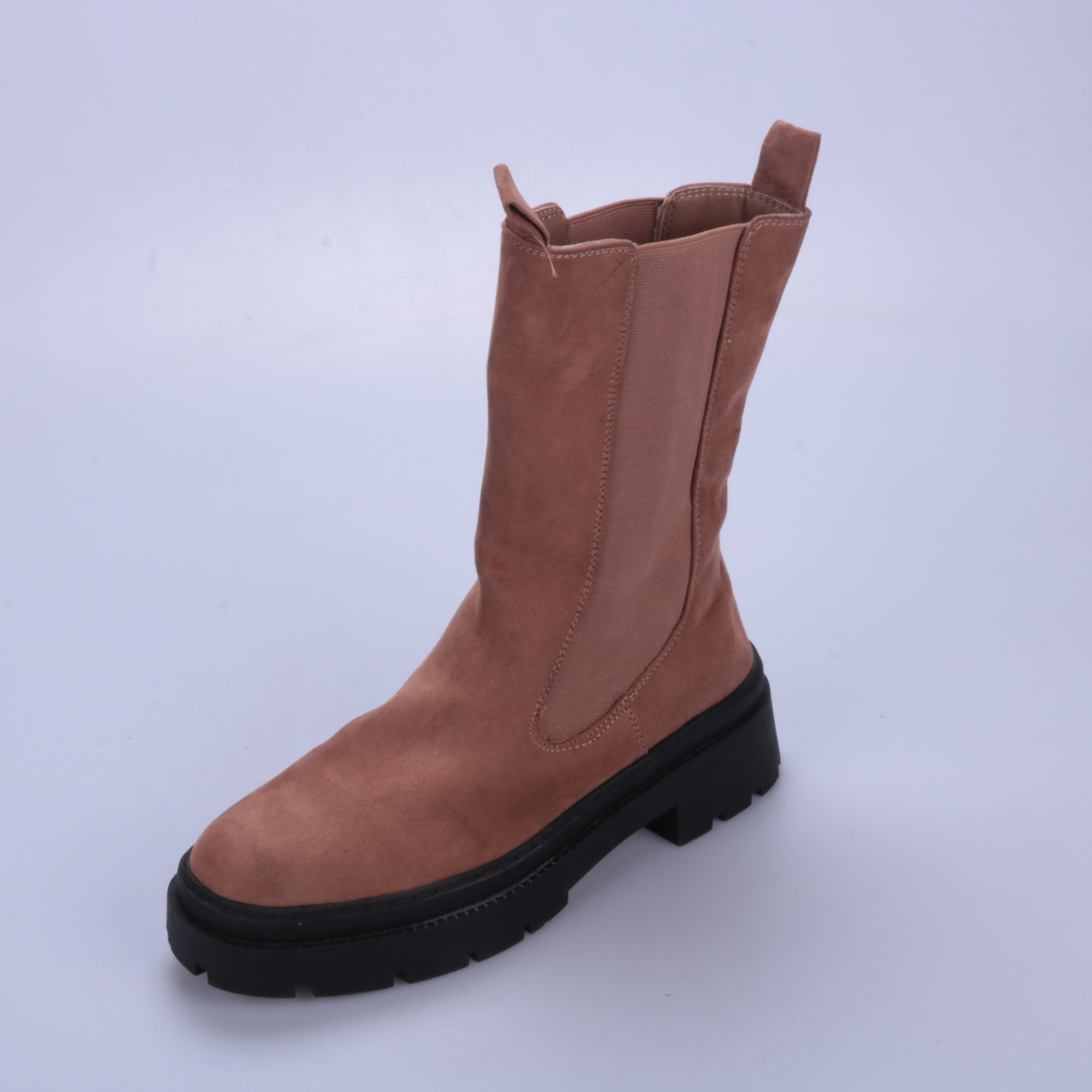 Женские полусапоги без бренда, выполнены под замшу в коричневом (пыльно-розовом) оттенке, с эластичными вставками по бокам. Подойдут для повседневных образов в демисезон с джинсами или платьями. Практичная массивная подошва с выраженным протектором даё...