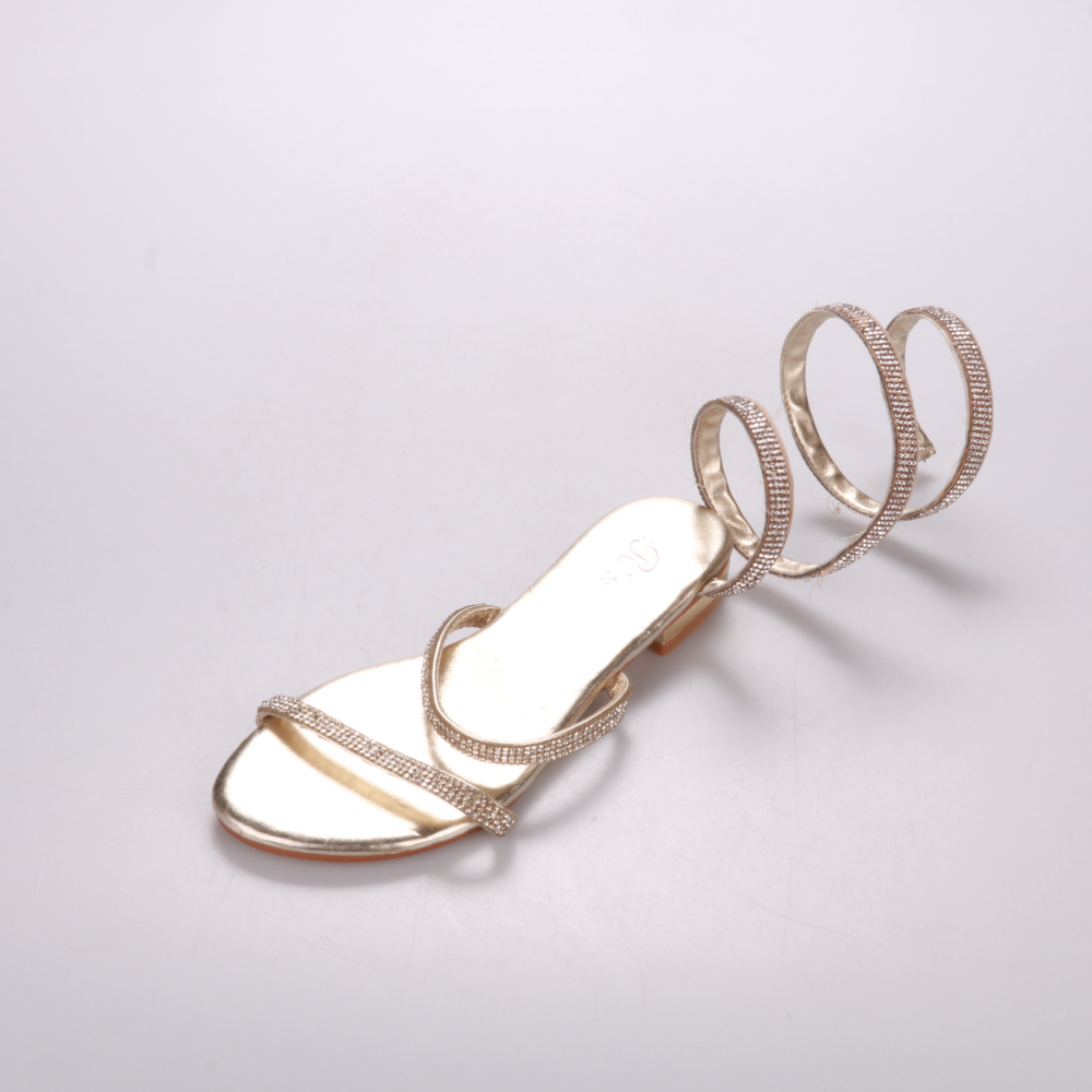 Женские сандалии R's в золотистом цвете с тонкими ремешками со стразами и спиральным ремнём вокруг щиколотки. Подойдут для летних прогулок и выхода, когда хочется добавить образу блеска. Плоская подошва и открытый носок делают их лёгкими и удобными в т...