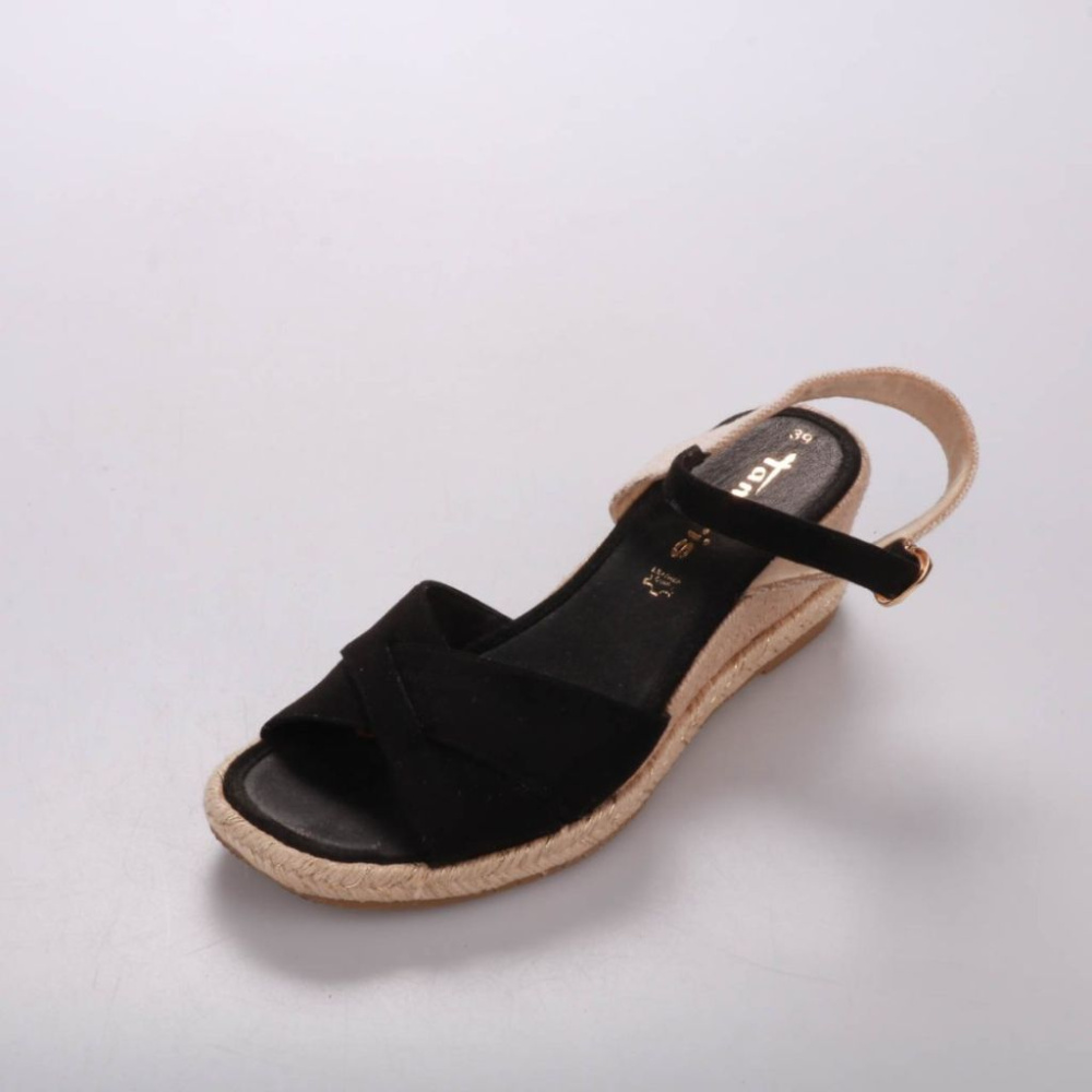 Женские сандалии Tamaris на устойчивой танкетке с джутовой отделкой и перекрещенными ремешками. Подойдут для лета и отдыха, хорошо смотрятся с платьями, шортами и джинсами. Удобно фиксируются ремешком с пряжкой и дают лёгкий подъём без высокого каблука.