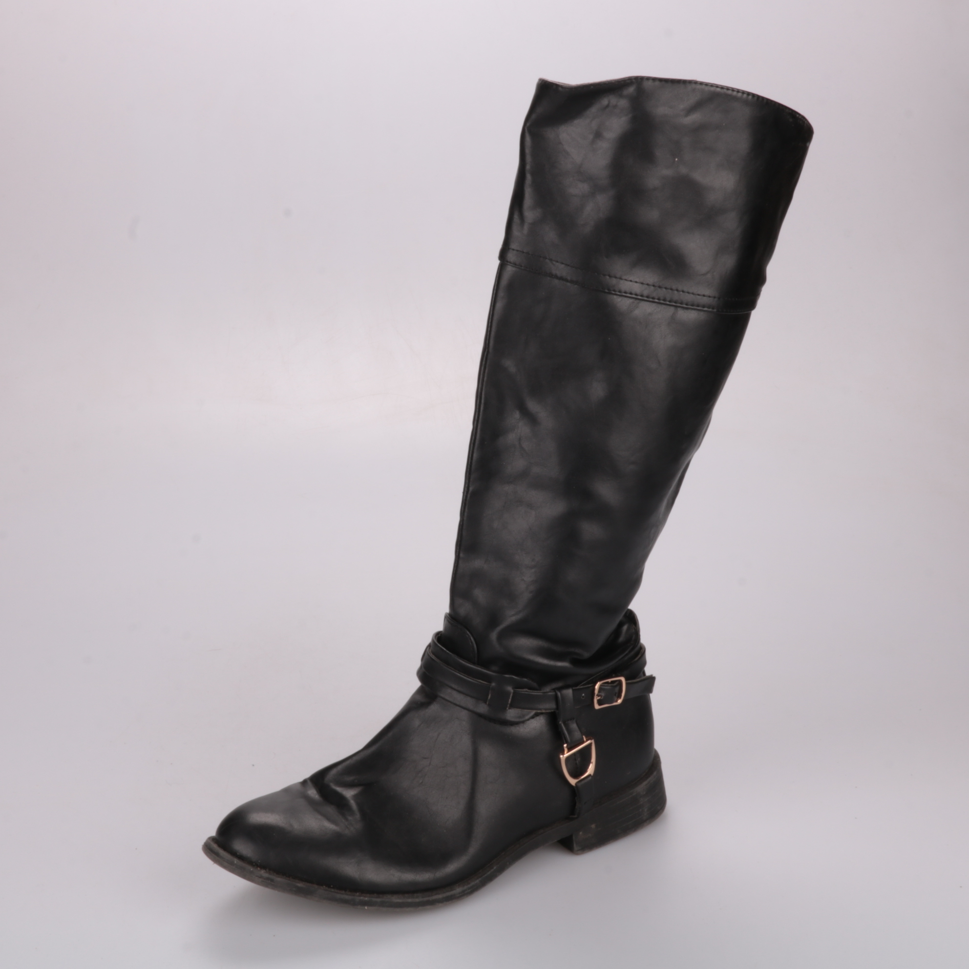 Женские чёрные сапоги без указанного бренда, с ремешком и декоративной металлической фурнитурой у щиколотки. Подойдут для повседневной носки в демисезон с джинсами или платьями. Практичная деталь — боковая молния, удобно надевать и снимать.
