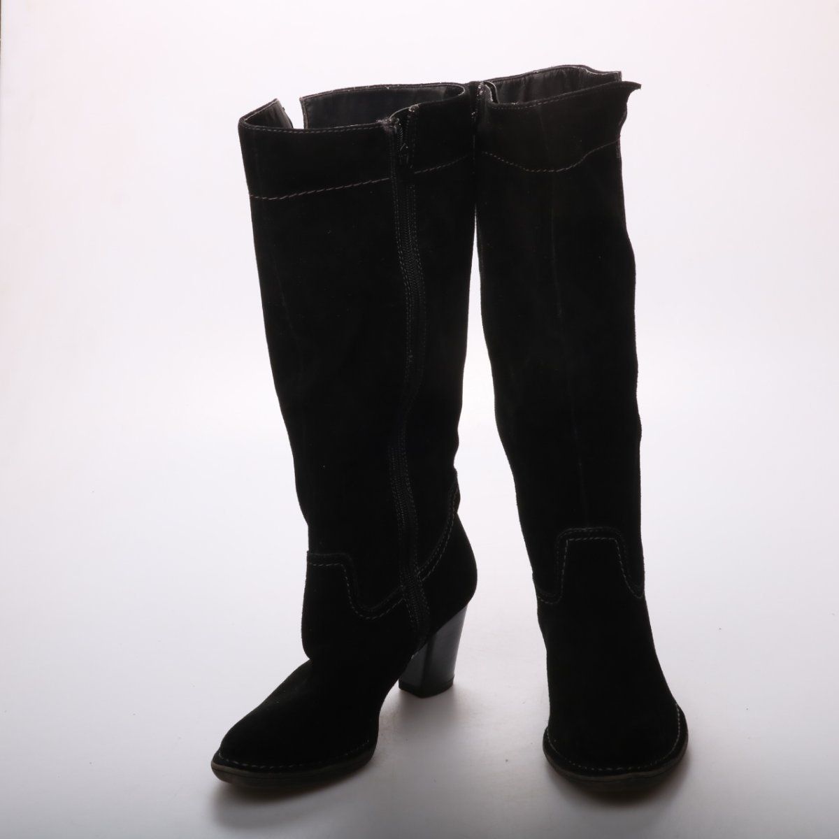 Женские сапоги из чёрной замши на устойчивом каблуке, с застёжкой-молнией по внутренней стороне. Подойдут для повседневной носки в прохладную погоду и будут хорошо смотреться с платьями и брюками. Практичная рифлёная подошва снижает скольжение.