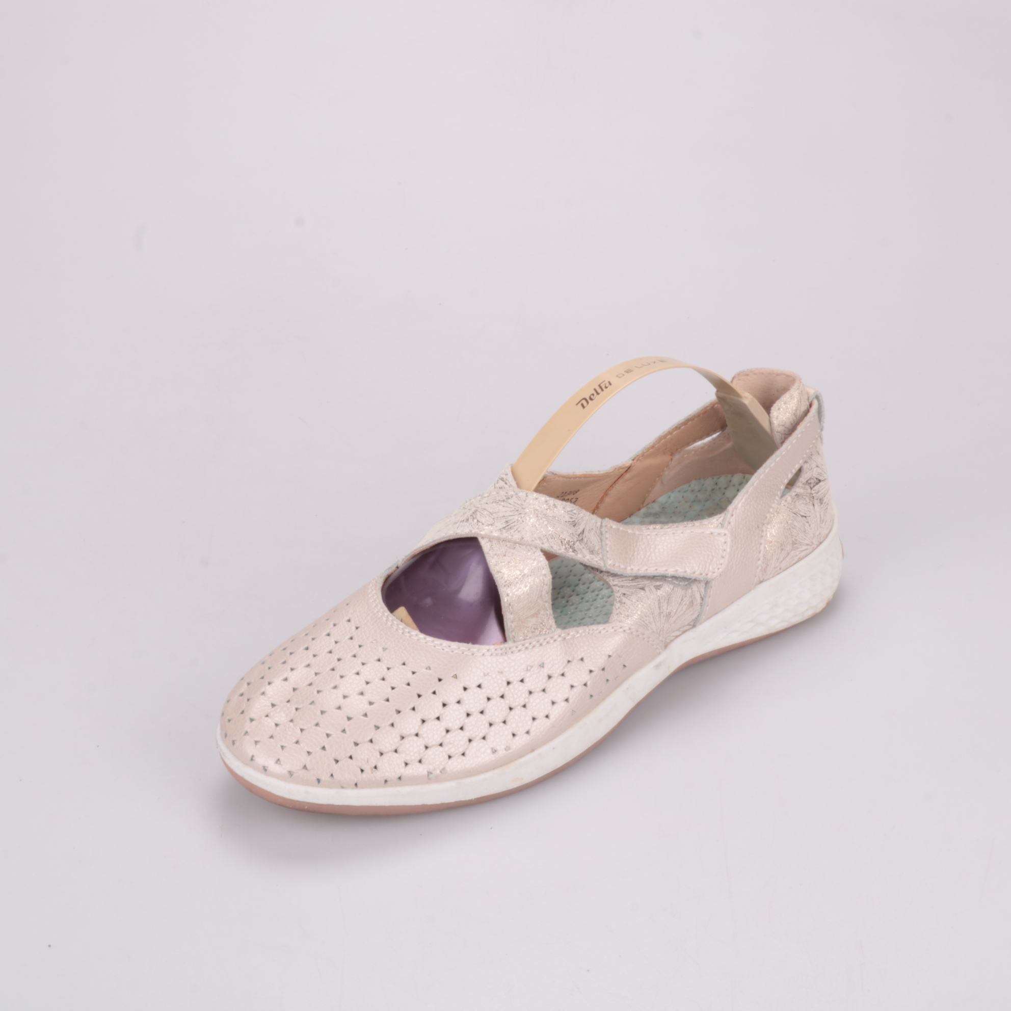Женские туфли Delta светло-бежевого цвета с перфорацией и перекрёстными ремешками на подъёме. Подойдут для тёплой погоды и повседневных прогулок, когда важны лёгкость и вентиляция. Мягкая подошва помогает комфортно ходить целый день.