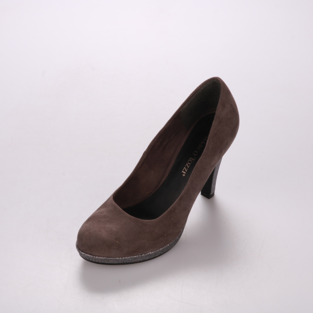 Туфли Marco Tozzi из замши коричневого цвета с устойчивым каблуком и серебристой отделкой по канту. Подойдут для офиса, мероприятий и вечерних выходов, хорошо сочетаются с платьями и брюками. Практичное преимущество — удобная посадка и устойчивый каблу...