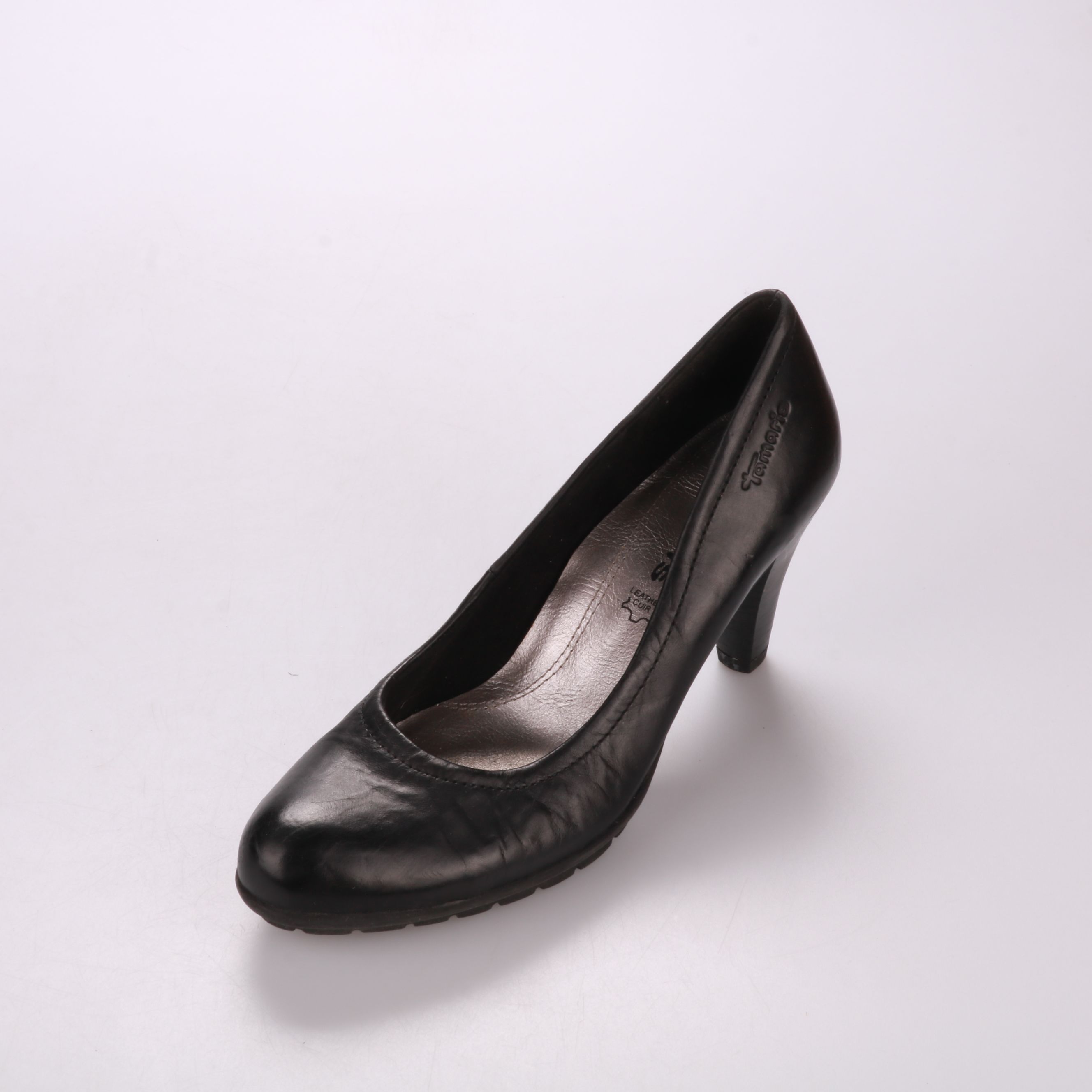 Туфли Tamaris из чёрной гладкой кожи на среднем каблуке, с округлым носком. Подойдут для офиса и повседневных выходов, хорошо сочетаются с платьями и брюками. Рельефная подошва делает ходьбу более устойчивой.