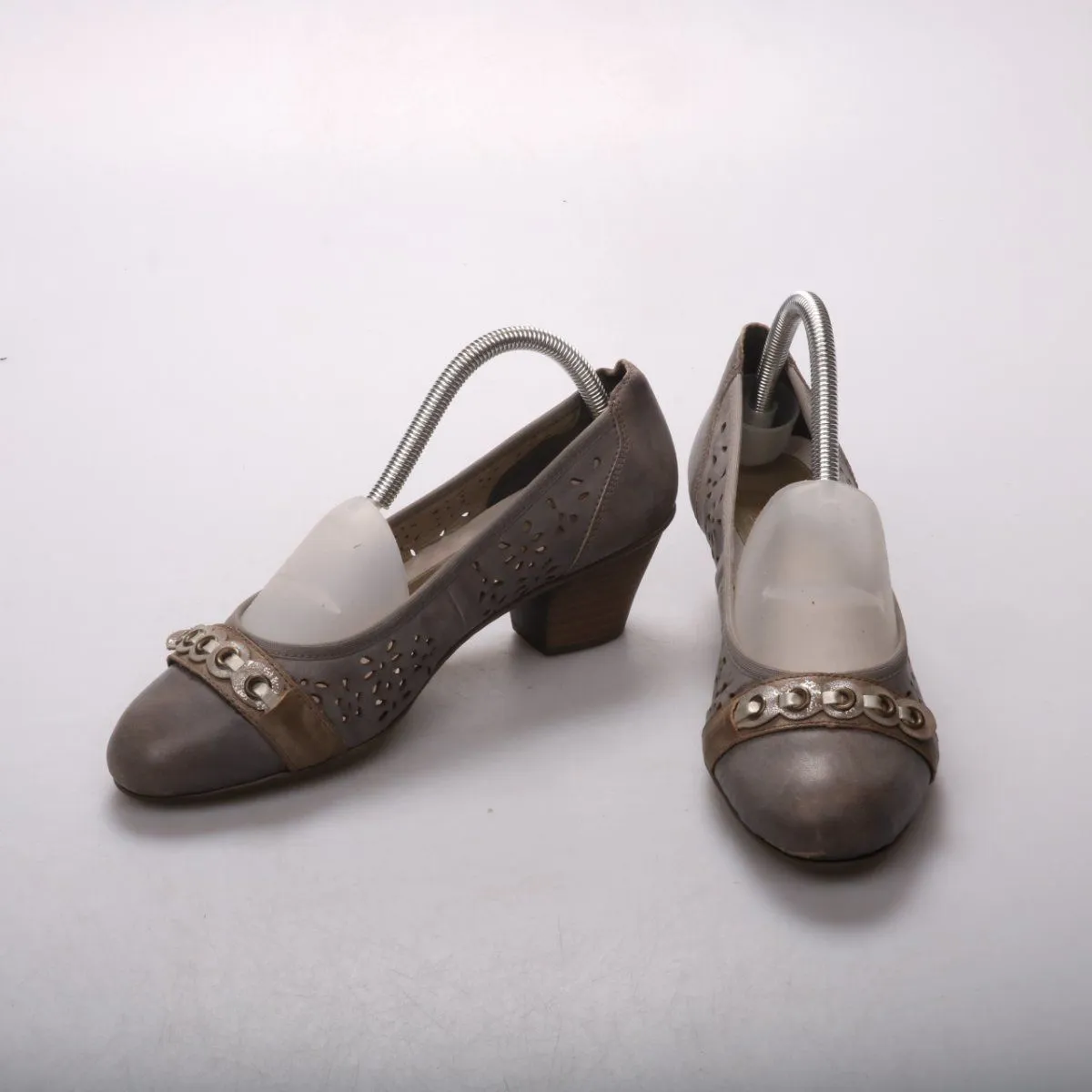Женские туфли Rieker серого цвета с перфорацией по бокам и декоративной вставкой с цепочкой на мысе. Подойдут для повседневной носки и офиса в тёплый демисезон. Устойчивый каблук делает посадку более комфортной при ходьбе.