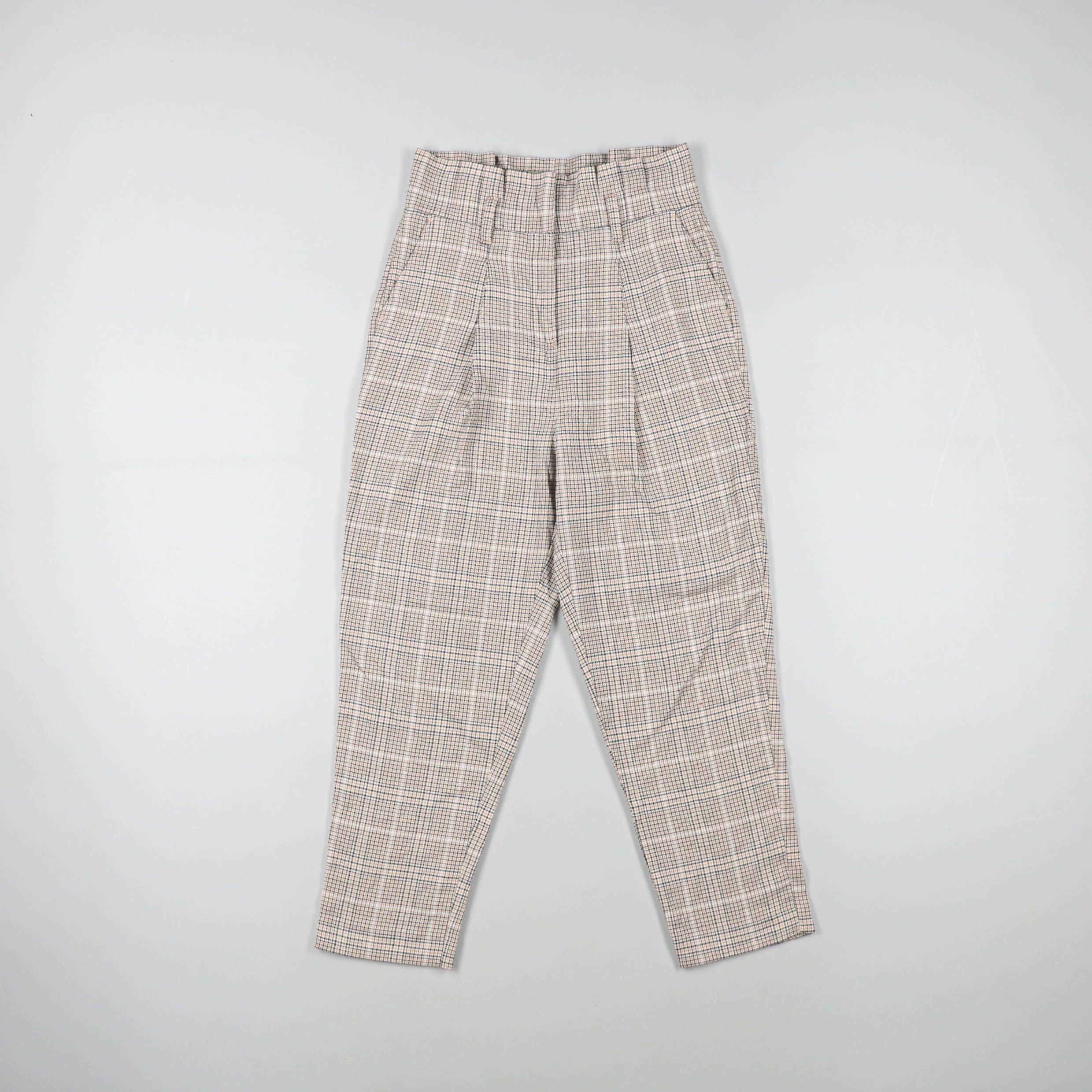 Женские брюки в мелкую клетку, с высокой посадкой и зауженными штанинами. Подойдут для офиса и повседневных образов с рубашкой или базовым трикотажем. Практичный плюс — немаркий принт, который легко сочетать с однотонными вещами.