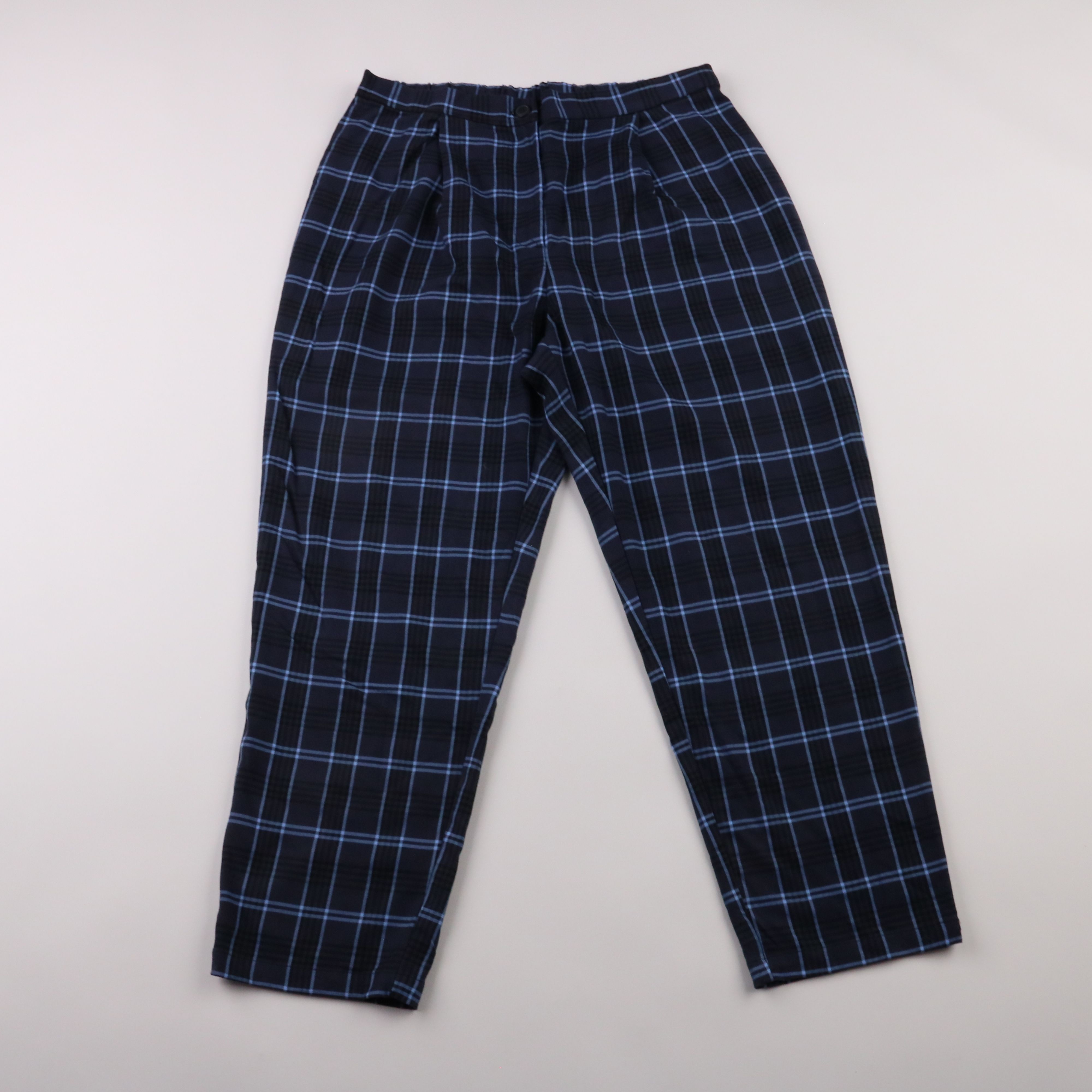 Мужские брюки в синюю клетку, без указания бренда. Подойдут для повседневных образов и офиса в стиле casual. Практичный плюс — эластичный пояс, удобно сидят и не стесняют движения.