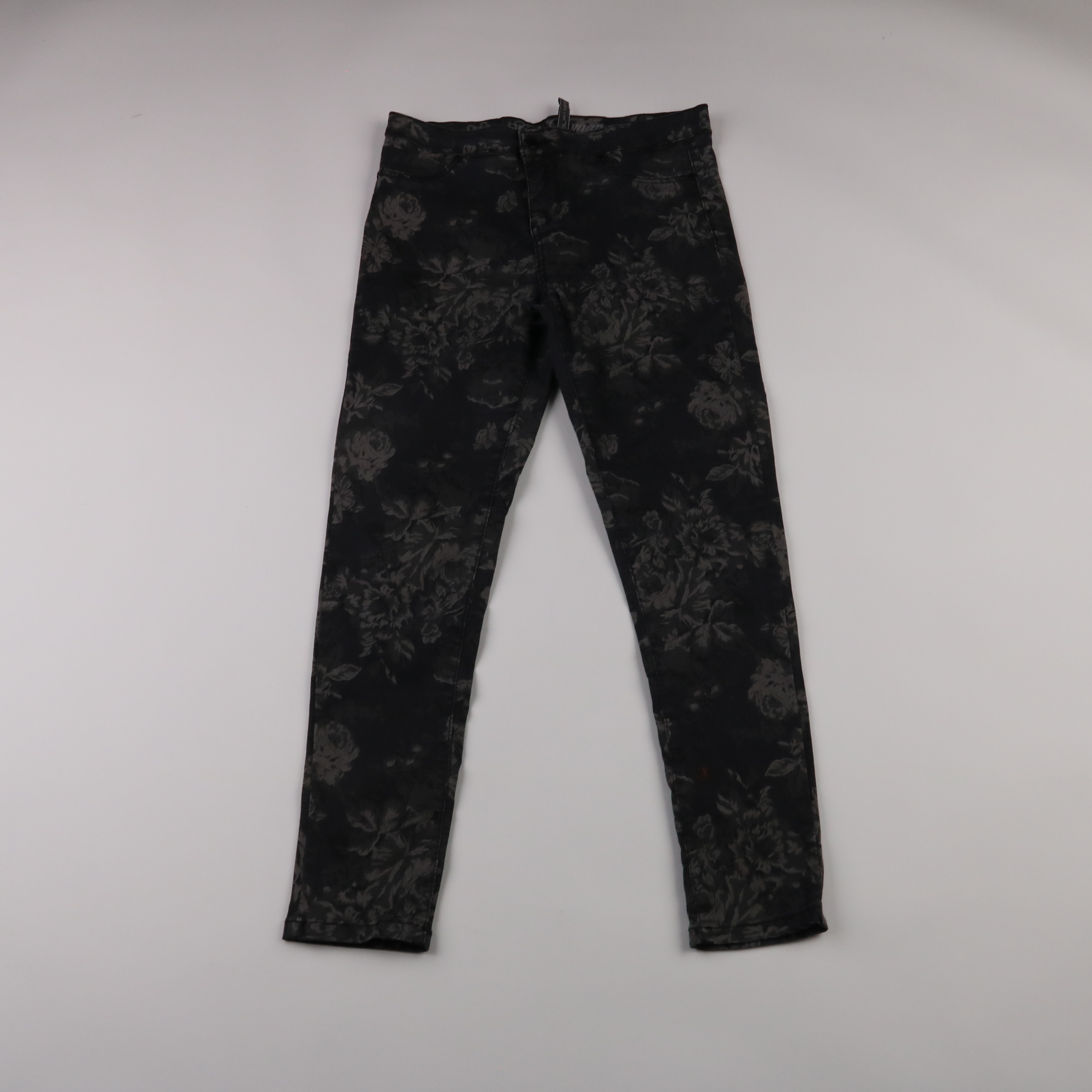 Женские брюки Zara в чёрном цвете с тёмным цветочным принтом, облегающего кроя. Подойдут для повседневных образов и вечерних выходов с однотонным верхом. Плотная ткань хорошо держит форму и комфортно сидит по фигуре.