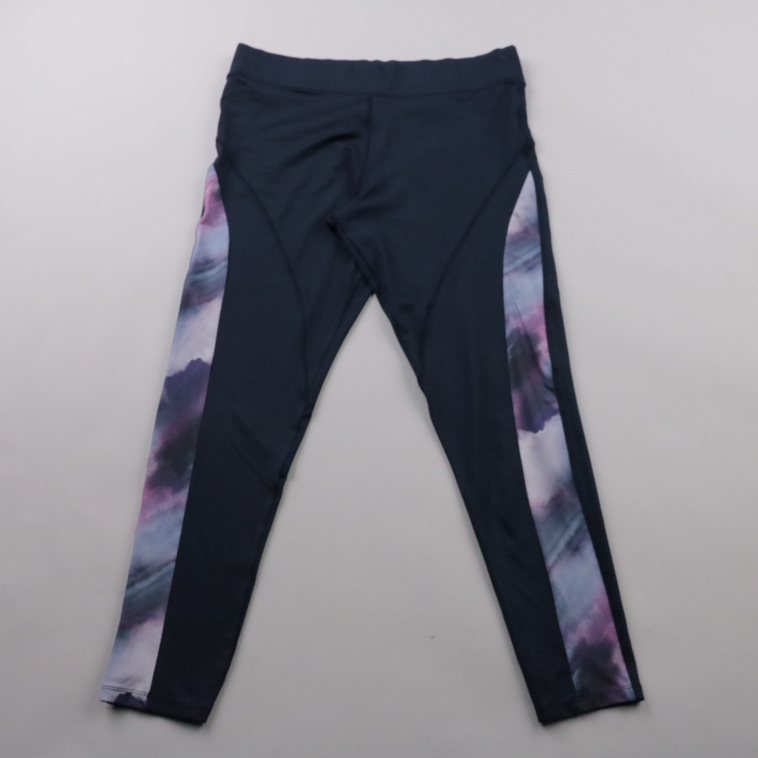 Женские легинсы F&F Active чёрного цвета с контрастными боковыми вставками с абстрактным принтом. Подойдут для тренировок, йоги и активных прогулок, хорошо тянутся и не сковывают движения. Эластичный пояс удобно держится на талии.