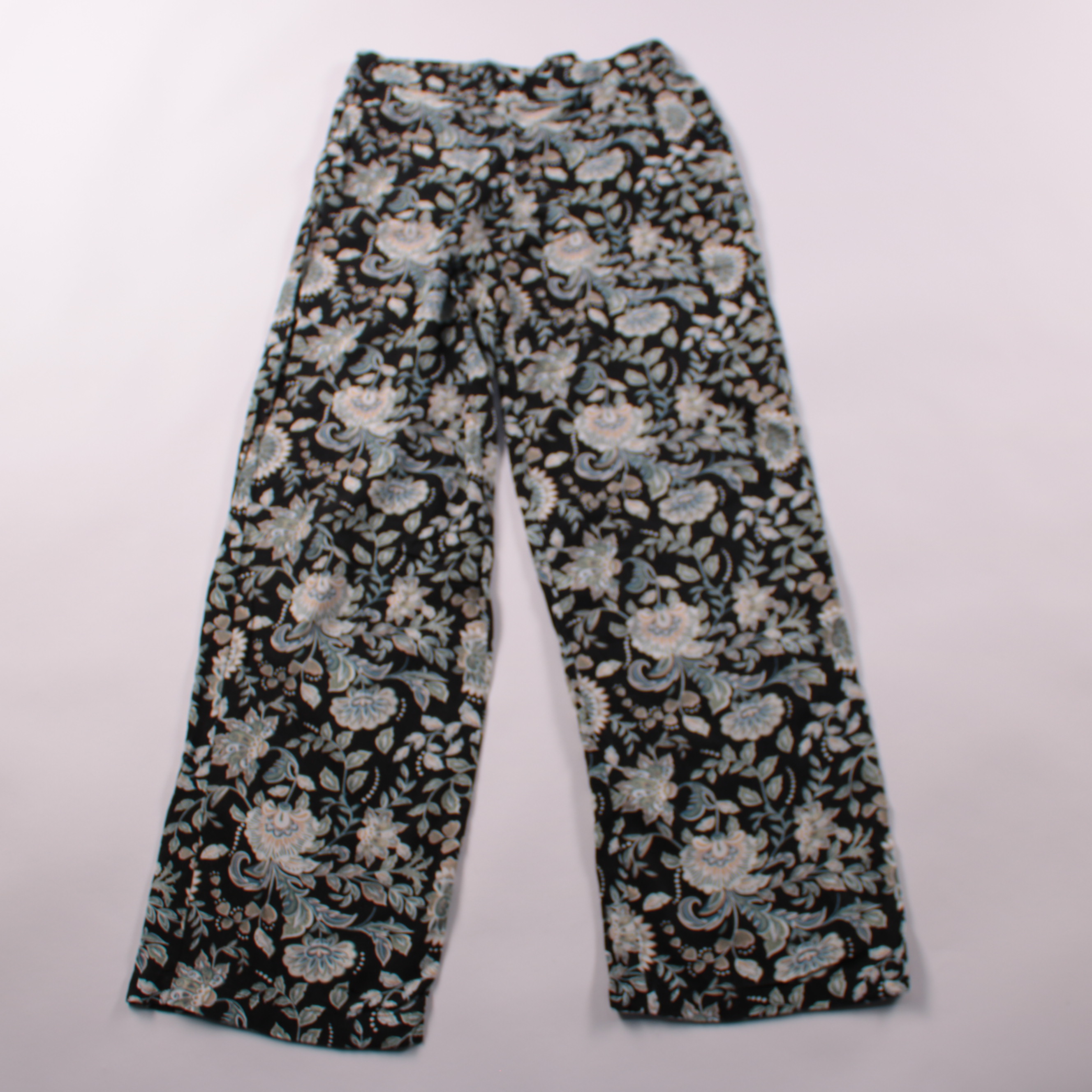 Лёгкие женские брюки Janina с эластичным поясом и цветочным принтом на чёрном фоне. Подойдут для лета и отпуска, а также для повседневных прогулок с однотонными топами и футболками. Практичный плюс — пояс на резинке комфортно садится и не сковывает дви...