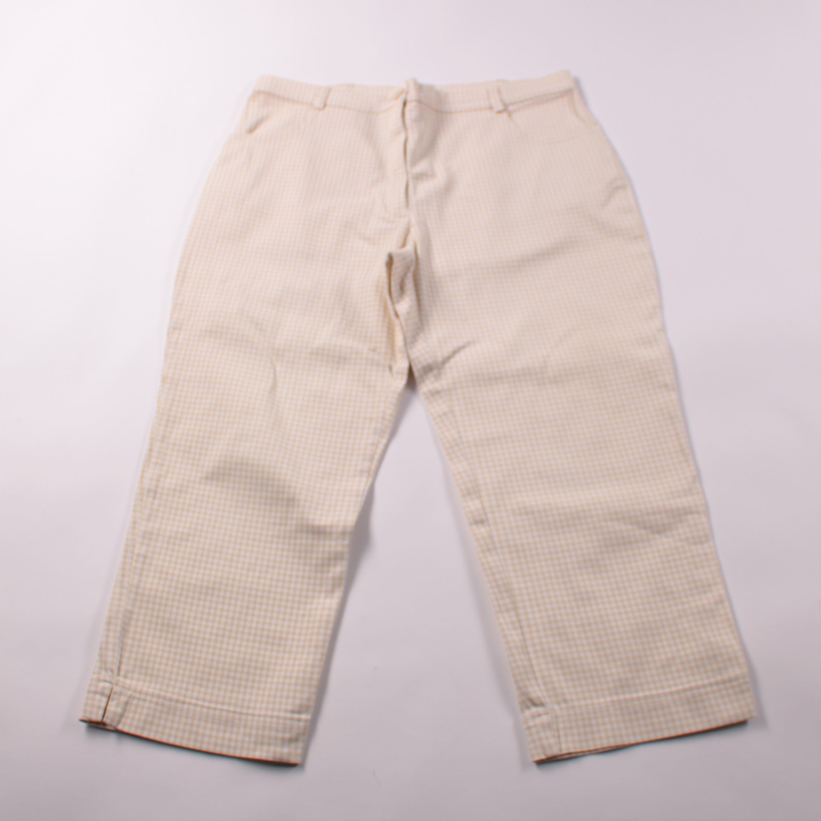 Женские брюки в мелкую клетку (бежево-белый оттенок), без яркого декора. Подойдут для повседневных образов и офисных комплектов в тёплую погоду. Практичны за счёт светлой базовой расцветки — легко сочетать с однотонными топами и рубашками.