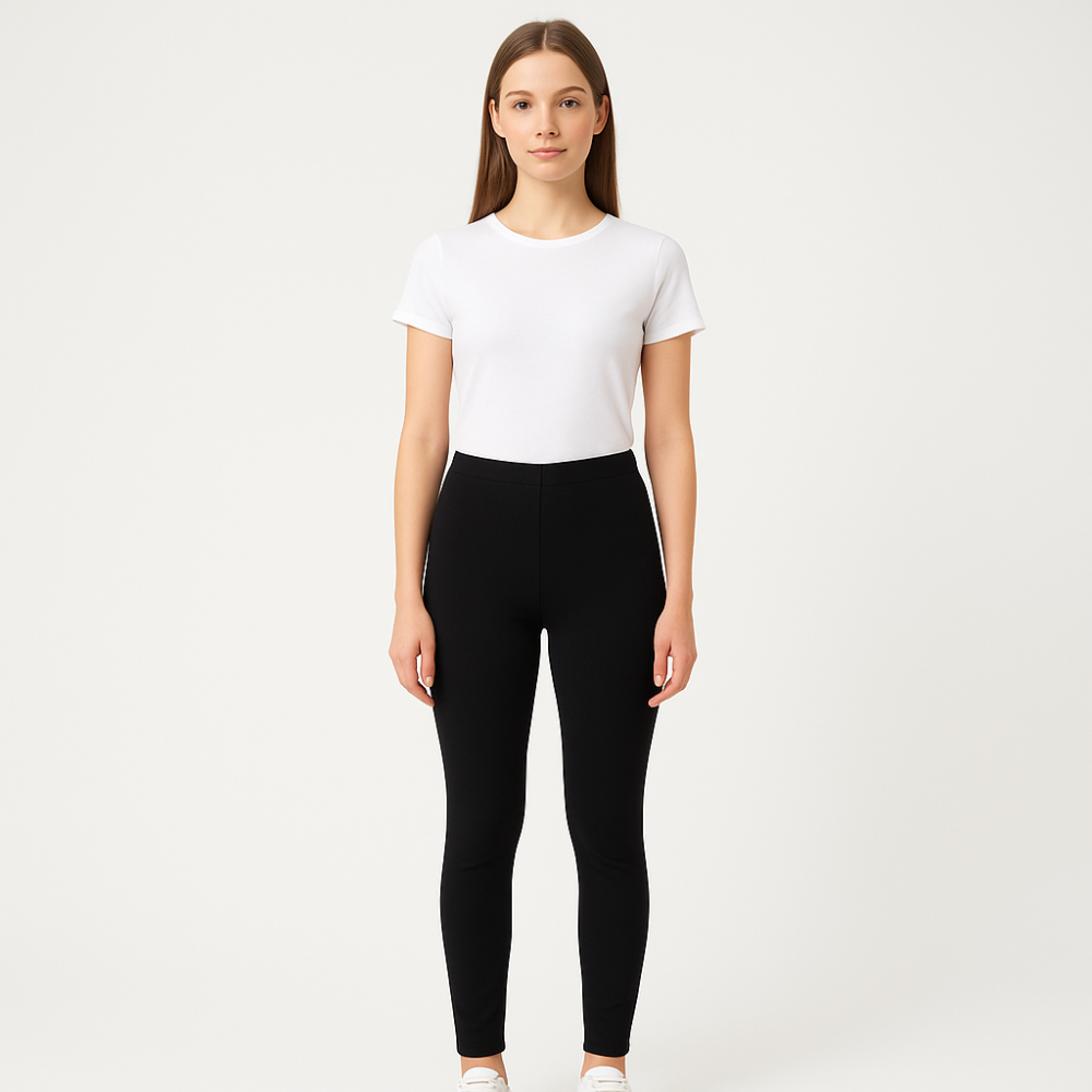 Женские легинсы Esmara из плотного эластичного трикотажа, однотонные чёрные. Подойдут для спорта, прогулок и повседневных образов с футболками и худи. Материал тянется и хорошо облегает, поэтому в них комфортно двигаться и они не стесняют шаг.