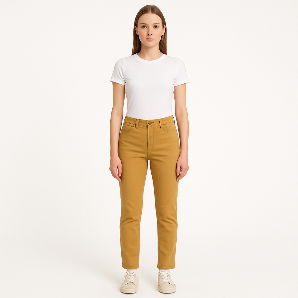 Женские брюки Stradivarius горчичного оттенка, зауженного к низу кроя и с высокой посадкой. Подойдут для повседневных образов с футболками, рубашками и кедами в тёплый сезон и в межсезонье. Плотная ткань держит форму и удобна в носке.
