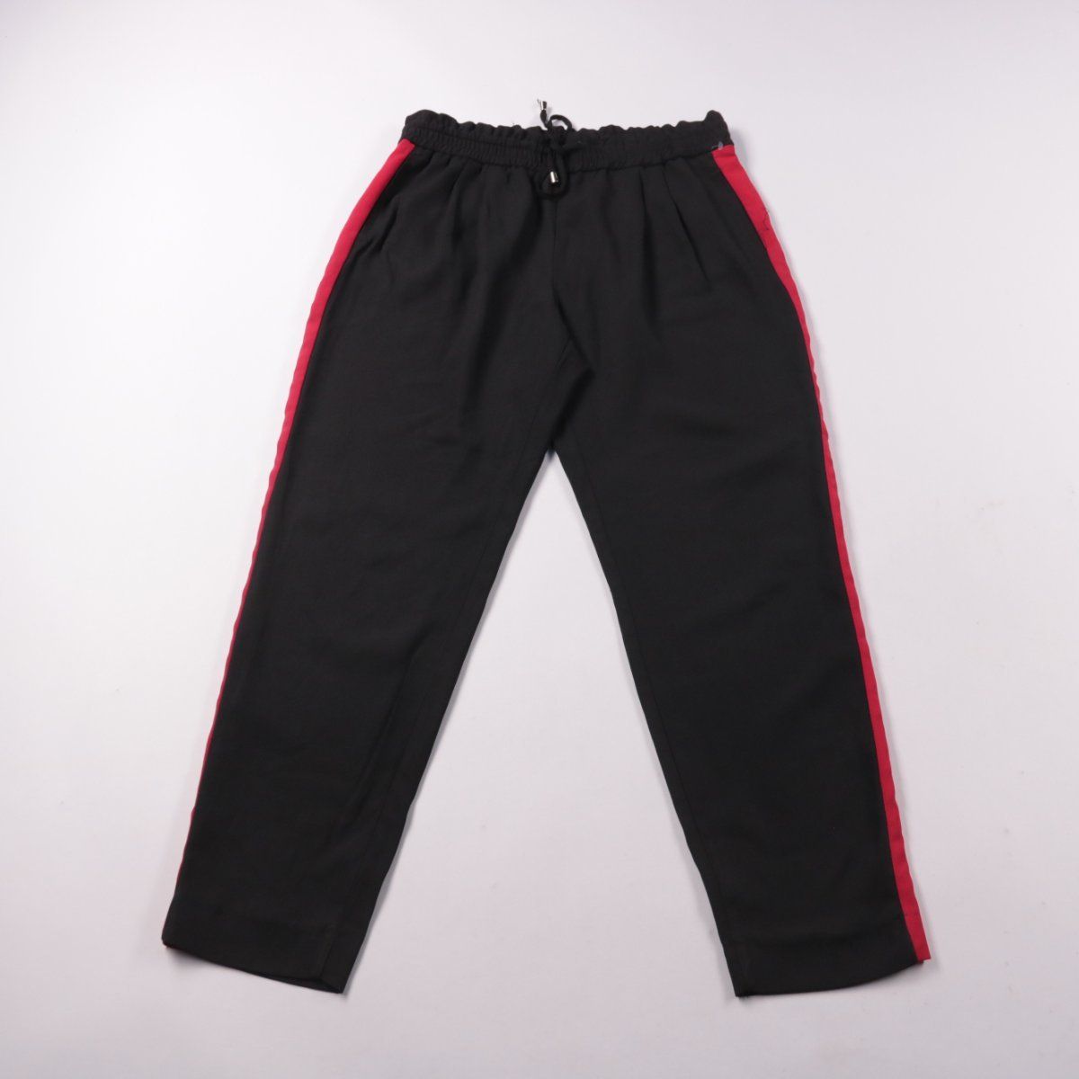 Брюки Zara Basic чёрного цвета с красными лампасами по бокам и поясом на резинке со шнурком. Подойдут для повседневных образов и прогулок в городе. Практичный плюс — полиэстер почти не мнётся и легко в уходе.