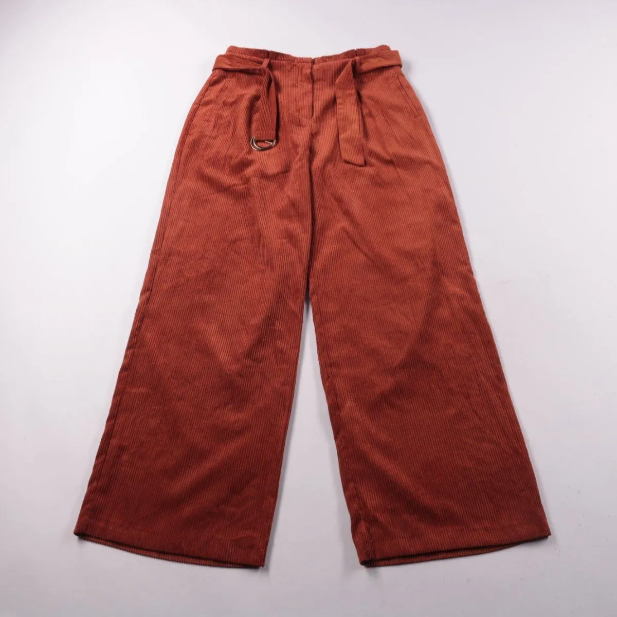 Вельветовые брюки Primark терракотового цвета с высокой посадкой и поясом с пряжкой. Широкие штанины подойдут для повседневных образов в прохладную погоду. Плотная ткань хорошо держит форму и комфортна в носке.