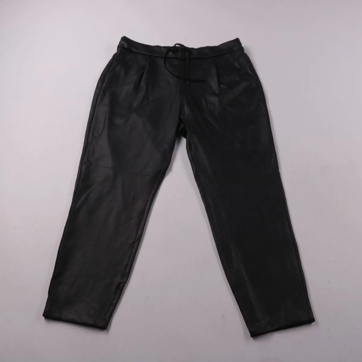 Женские брюки Vero Moda из материала под кожу, чёрного цвета, с эластичным поясом и шнурком. Подойдут для повседневных образов в прохладную погоду и на выход, хорошо сочетаются с ботинками и кроссовками. Практичный плюс — пояс на резинке комфортно садится по талии.