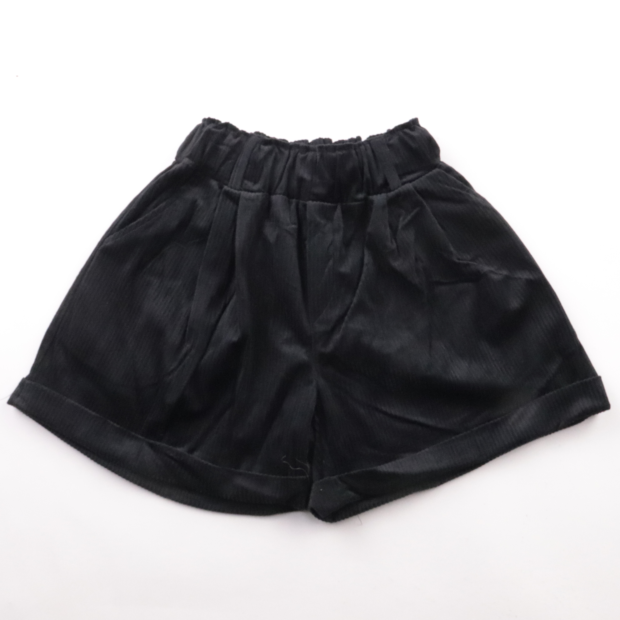 Женские чёрные шорты с высокой посадкой и эластичным поясом, материал гладкий с лёгким блеском. Подойдут для летних повседневных образов и поездок, когда хочется свободы движений. Пояс на резинке удобно садится по талии и не давит.