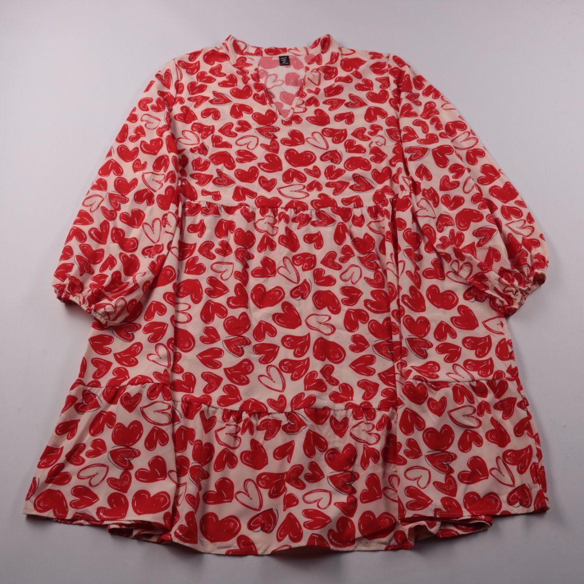 Женское платье SHEIN Curve с принтом сердечек, V-образным вырезом и ярусной юбкой. Подойдёт для повседневных образов и романтических выходов в тёплую погоду или в помещении. Ткань с добавлением эластана чуть тянется и комфортна в носке.