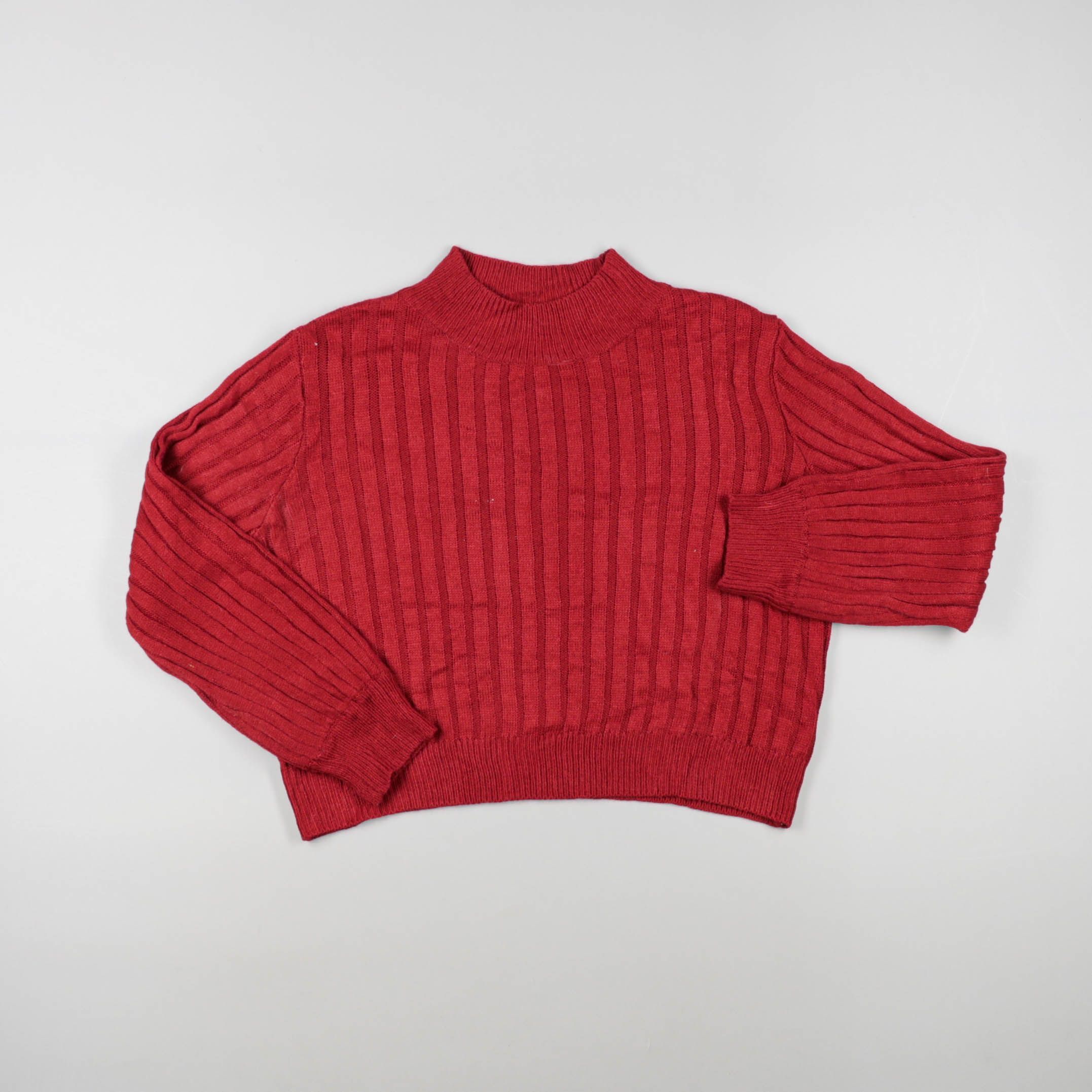 Вязаный свитер в рубчик с коротким воротником-стойкой и объёмными рукавами. Подойдёт для повседневных образов в прохладную погоду, легко сочетается с джинсами и юбками. Плотная фактура хорошо держит форму и даёт дополнительное тепло.