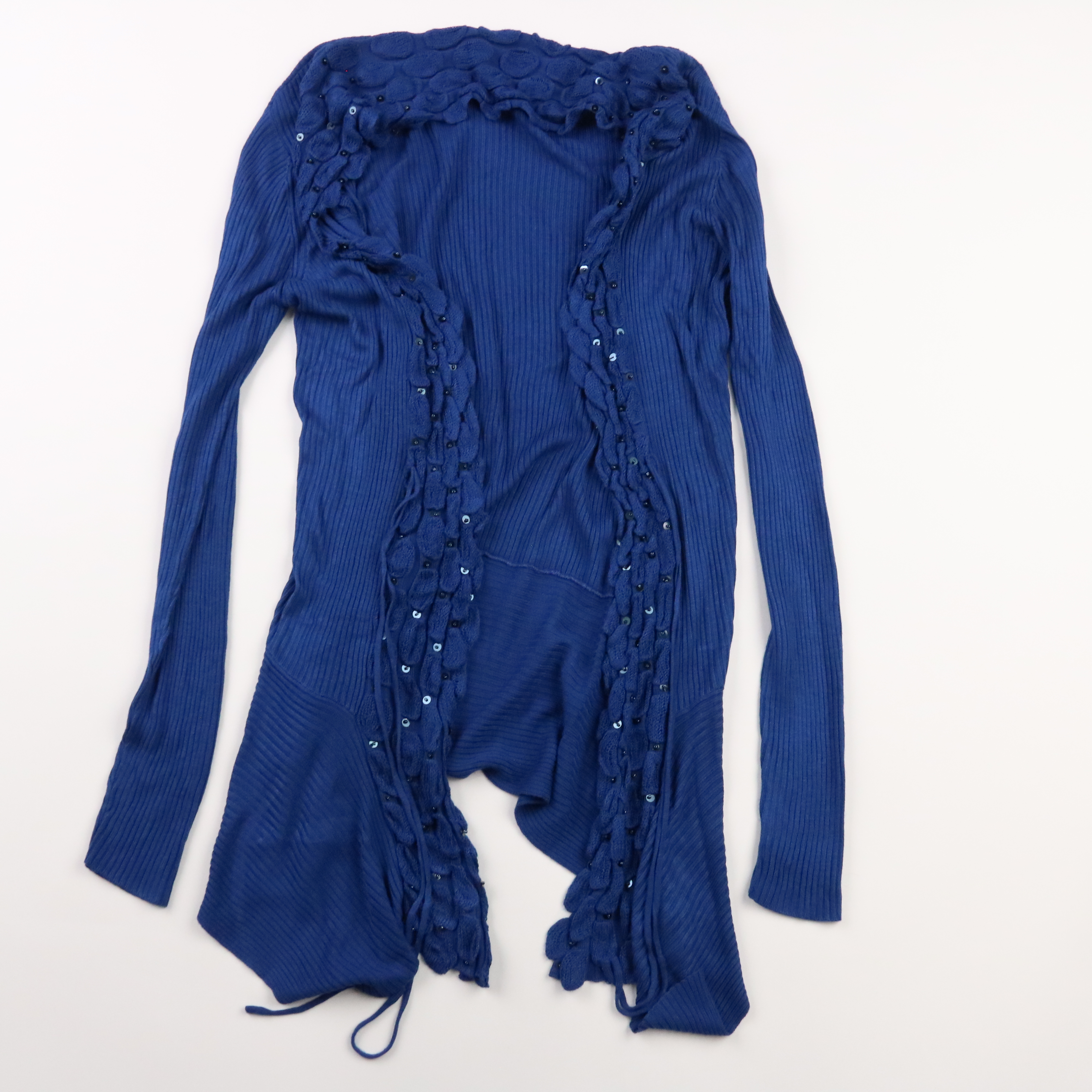 Трикотажный кардиган Freesia в насыщенном синем цвете, в рубчик, с длинным рукавом и асимметричным каскадным низом. По краю полочек и горловины — декоративная отделка с пайетками, хорошо смотрится как на топ, так и на платье. Вискоза в составе приятна ...