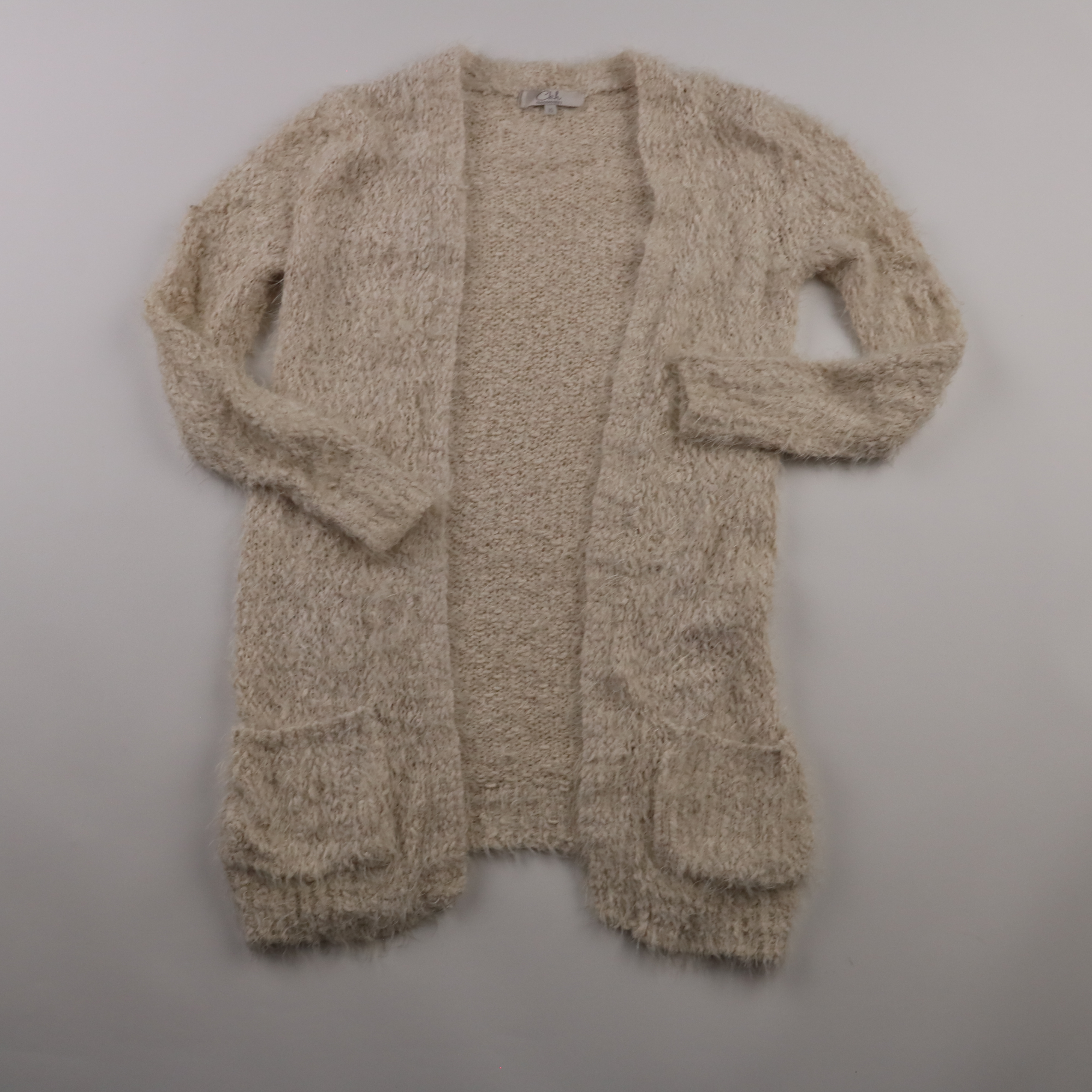 Вязаный кардиган Clockhouse бежевого цвета с мягкой «пушистой» фактурой и накладными карманами. Подойдёт для повседневных образов в прохладные дни, удобно носить поверх топа или водолазки. Лёгкий и тёплый, не сковывает движения.