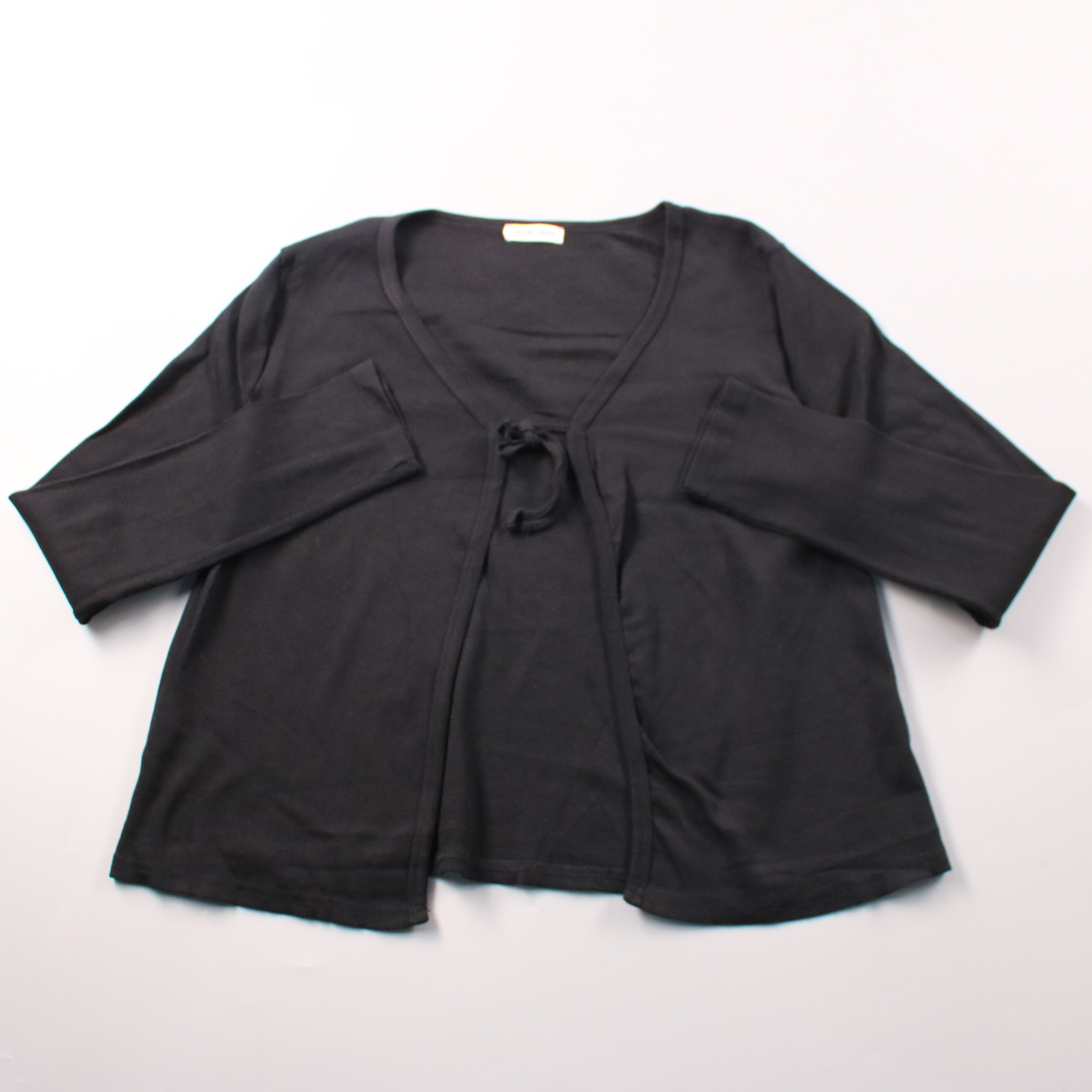 Женский кардиган Cache Cache чёрного цвета с V-образным вырезом и завязкой спереди. Подойдёт для офиса и повседневных образов, удобно накинуть поверх топа или платья в прохладном помещении. Практичный базовый вариант, легко сочетается с любой одеждой.