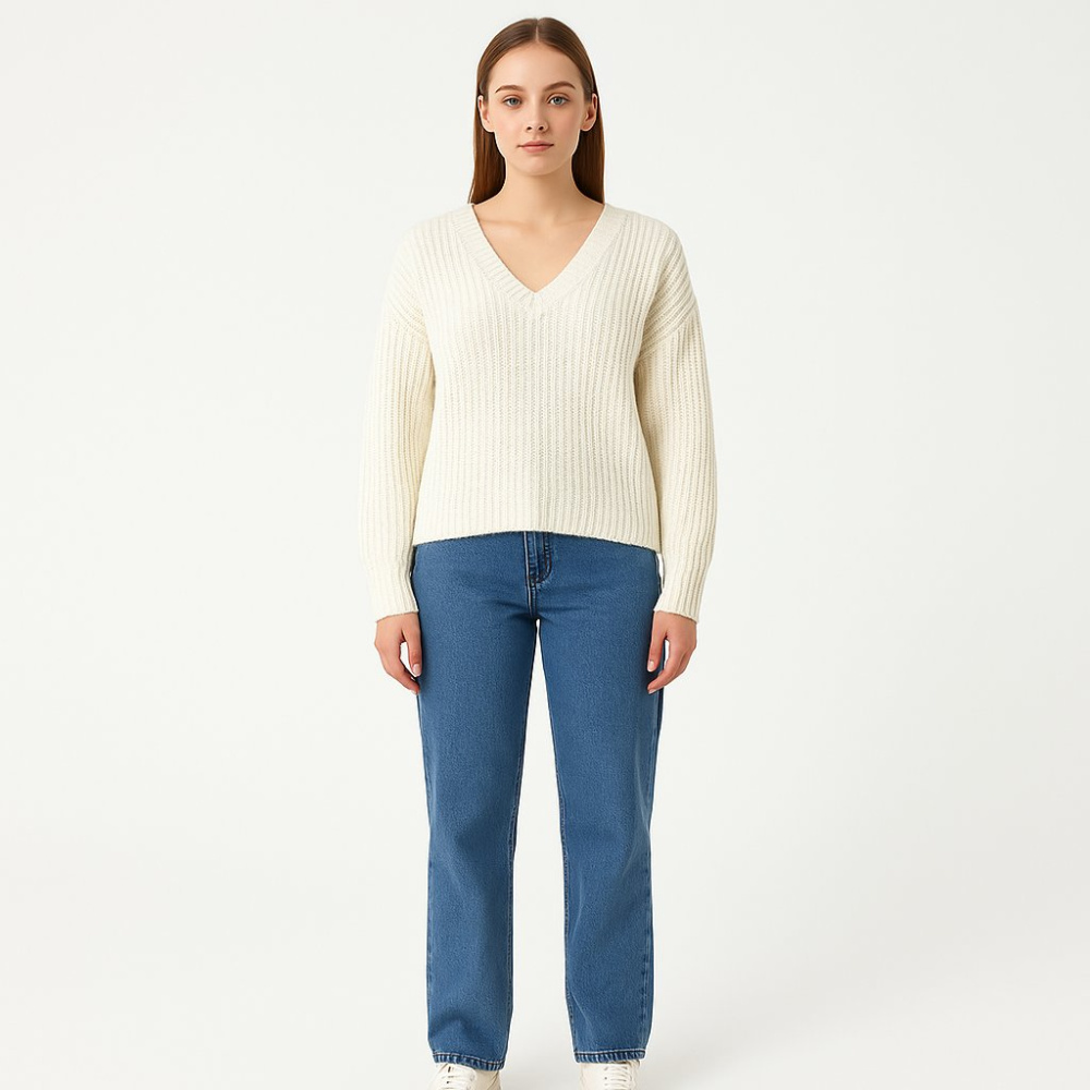 Вязаный свитер молочного цвета с V‑образным вырезом и фактурной вязкой в рубчик. Подойдёт для повседневных образов с джинсами или юбкой в прохладную погоду. Мягкий материал и свободный крой позволяют комфортно носить его слоями.