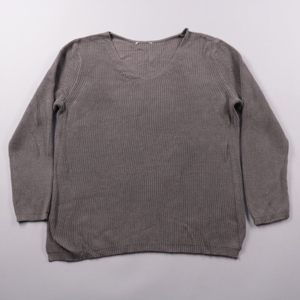 Женский вязаный джемпер с V-образным вырезом и длинным рукавом, фактурная вязка в рубчик. Подойдёт для повседневных образов на работу или прогулки, легко сочетается с джинсами и брюками. Практичен тем, что мягкий и удобный, не стесняет движений.