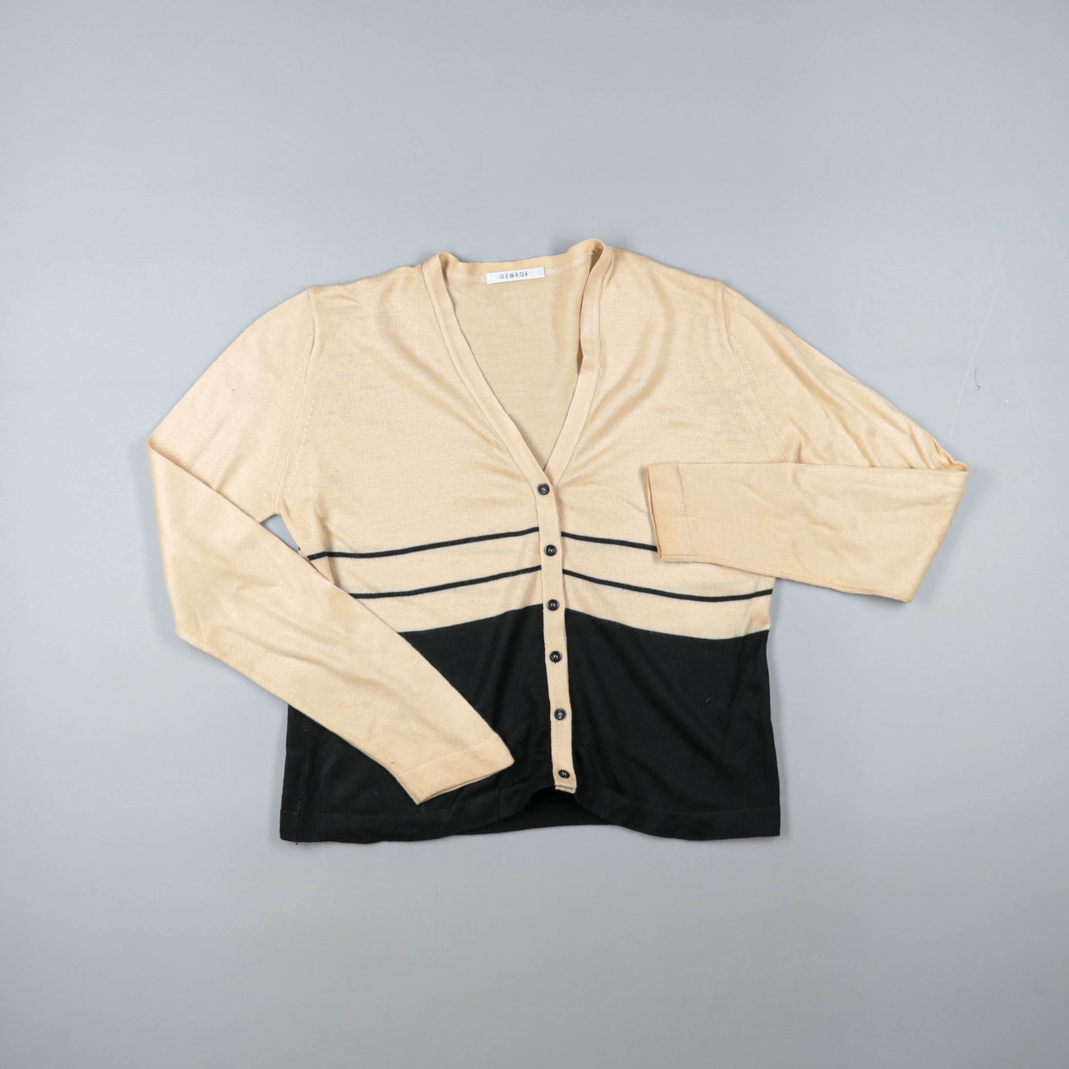 Женский кардиган George на пуговицах с V-образным вырезом и контрастным низом в чёрном цвете с тонкими полосками. Подойдёт для офиса и повседневных образов, удобно носить как на топ, так и поверх рубашки. Практичный вариант: легко комбинируется с базов...